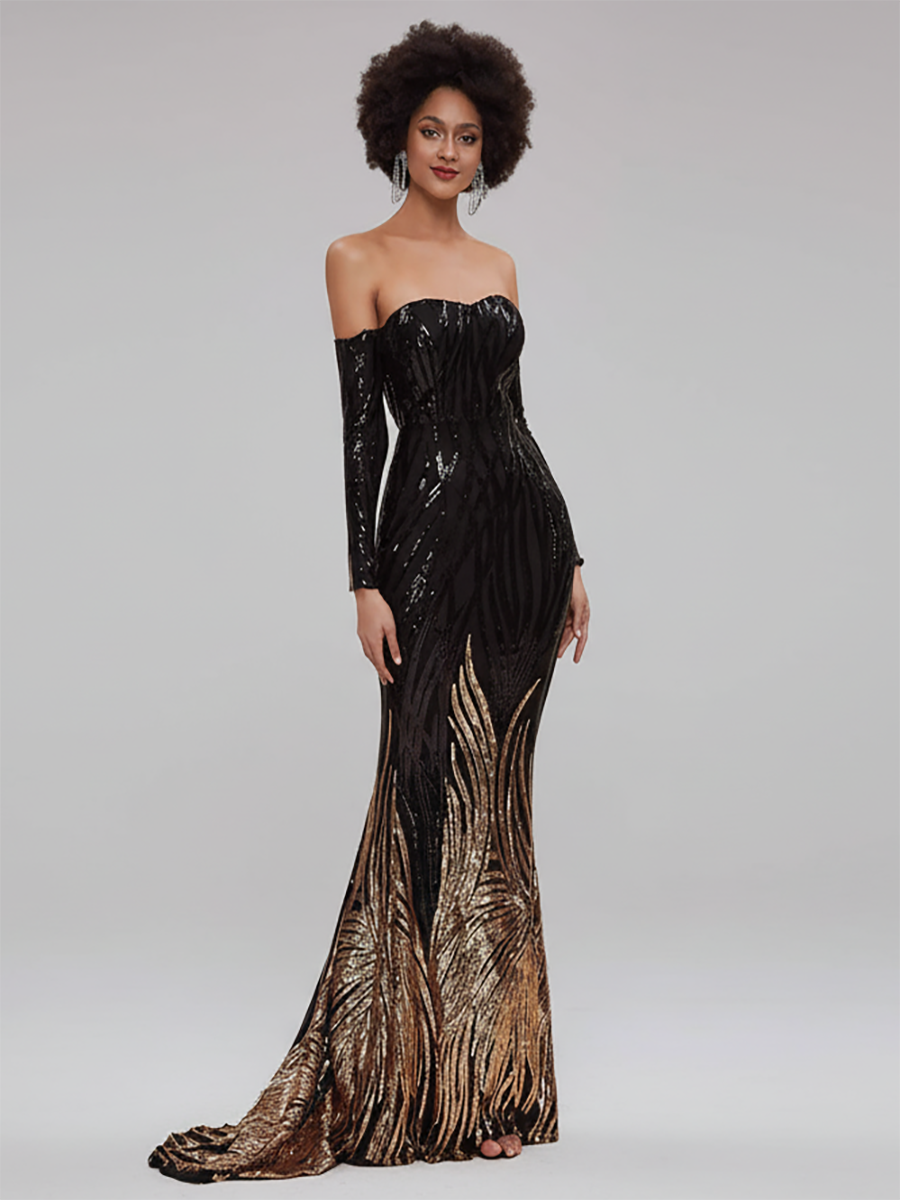 Skinny Off The Shoulder Sequin Gold Evening Dress WY91