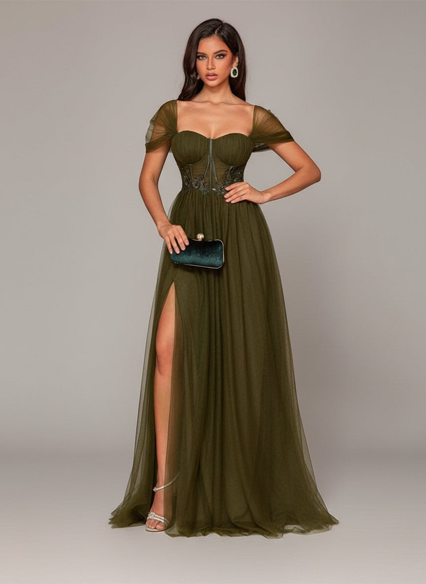 Square Neck Corset Split Mesh Prom Dress XF1022