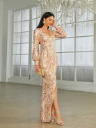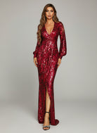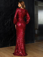 Dieses atemberaubende Ballkleid mit roten Pailletten verfügt über einen tiefen Ausschnitt, einen Wickelsaum und lange Ärmel. Dieser moderne Look eignet sich perfekt für jeden besonderen Anlass und sorgt für einen unvergesslichen Auftritt.