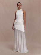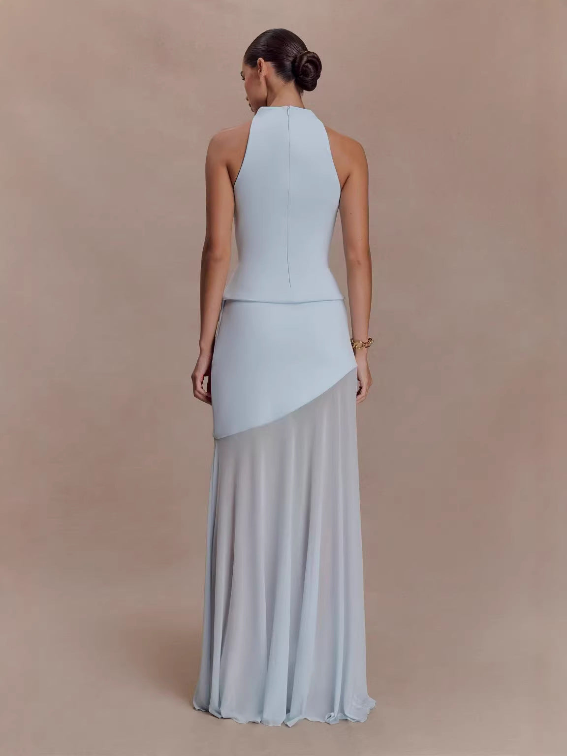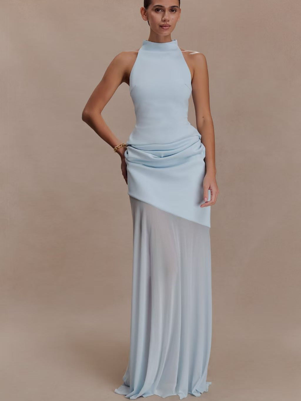Achieve modern sophistication with this unique light blue maxi gown. It features a sleek halter neck bodice, a gathered asymmetric draped waist panel, and a sheer flowy chiffon skirt that creates a layered, ethereal silhouette. The minimalist design makes it perfect for weddings, cocktail parties, and upscale evening events.