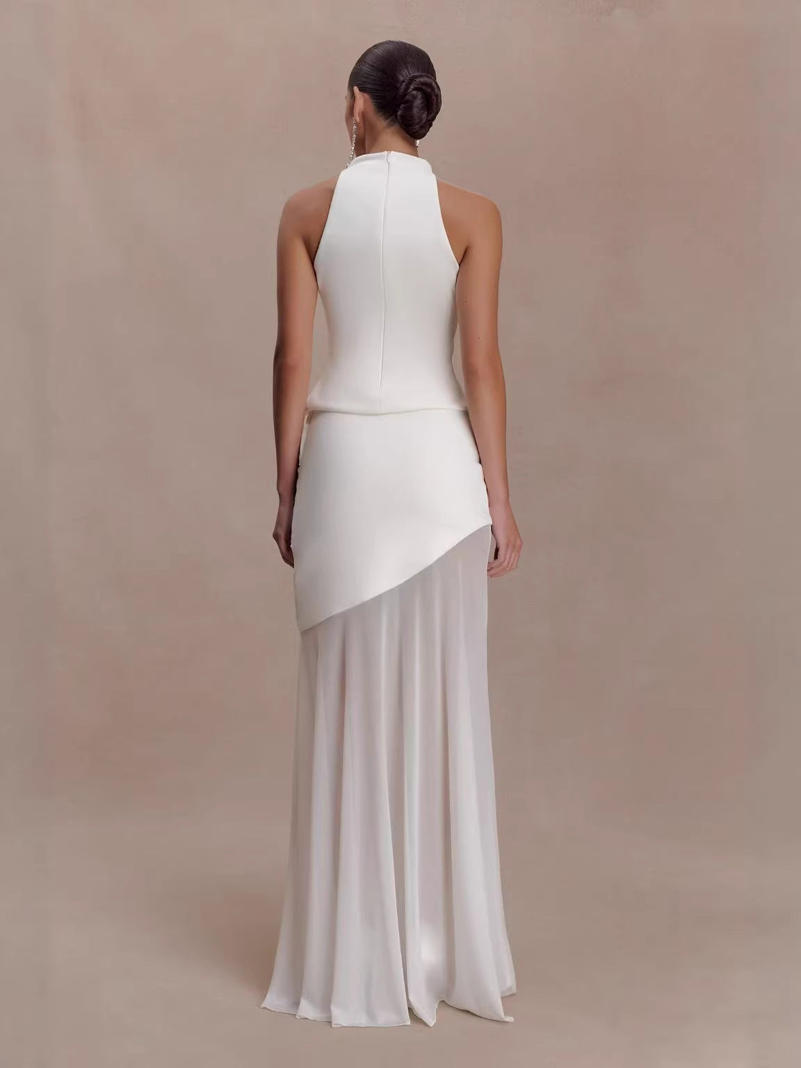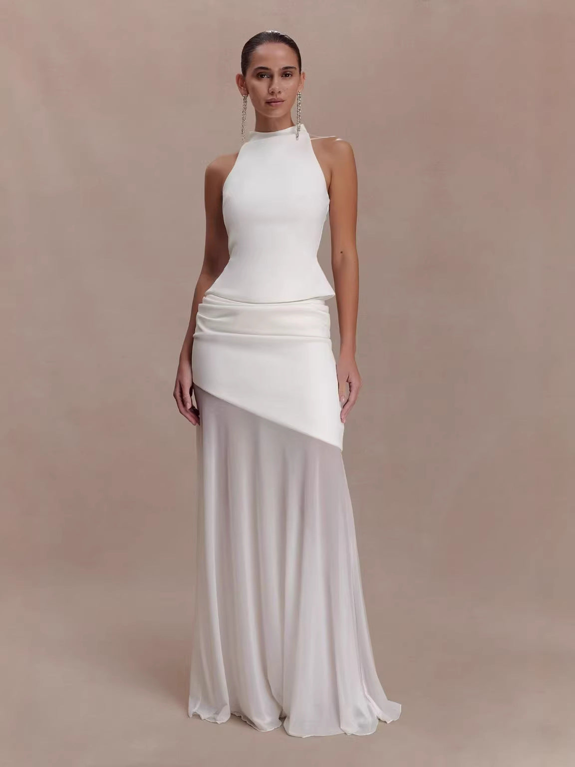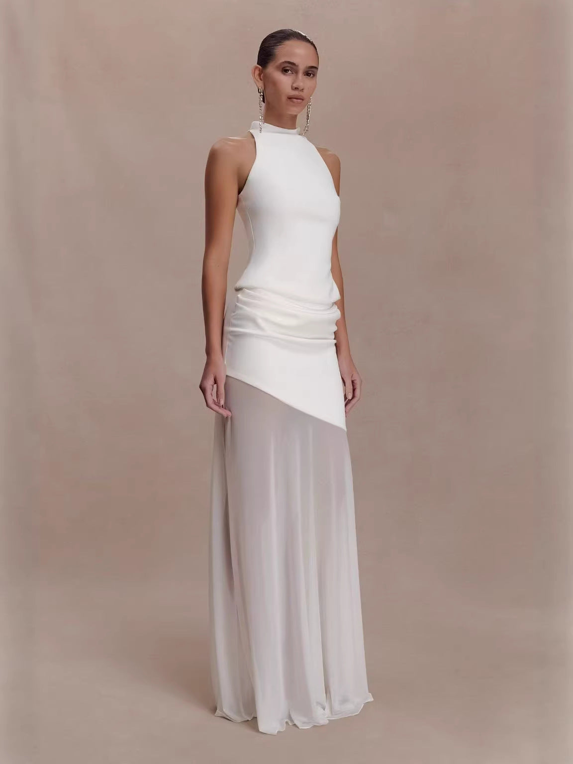 Halter Neck Asymmetric Draped Sheer Maxi Dress XF251339