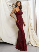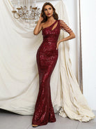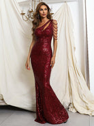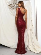Elegant One-Shoulder Burgundy Sequin Gown M01960
