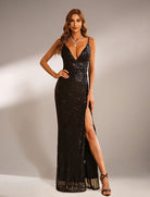 Schwarzes glitzerndes Maxi-Abendkleid mit V-Ausschnitt XJ282