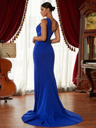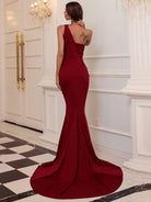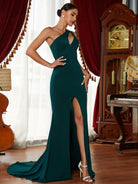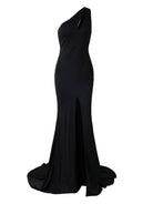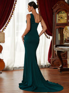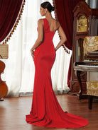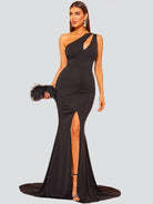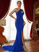 Dieses bodenlange One-Shoulder-Kleid verfügt über eine hohe Taille und einen schicken Ausschnitt mit Schlitz am Oberschenkel und einem klassischen Reißverschluss, um jedem Abschlussball eine glamouröse Note zu verleihen.