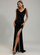 Abendkleid aus Samt mit Schlitz und Schulterkette M01298