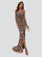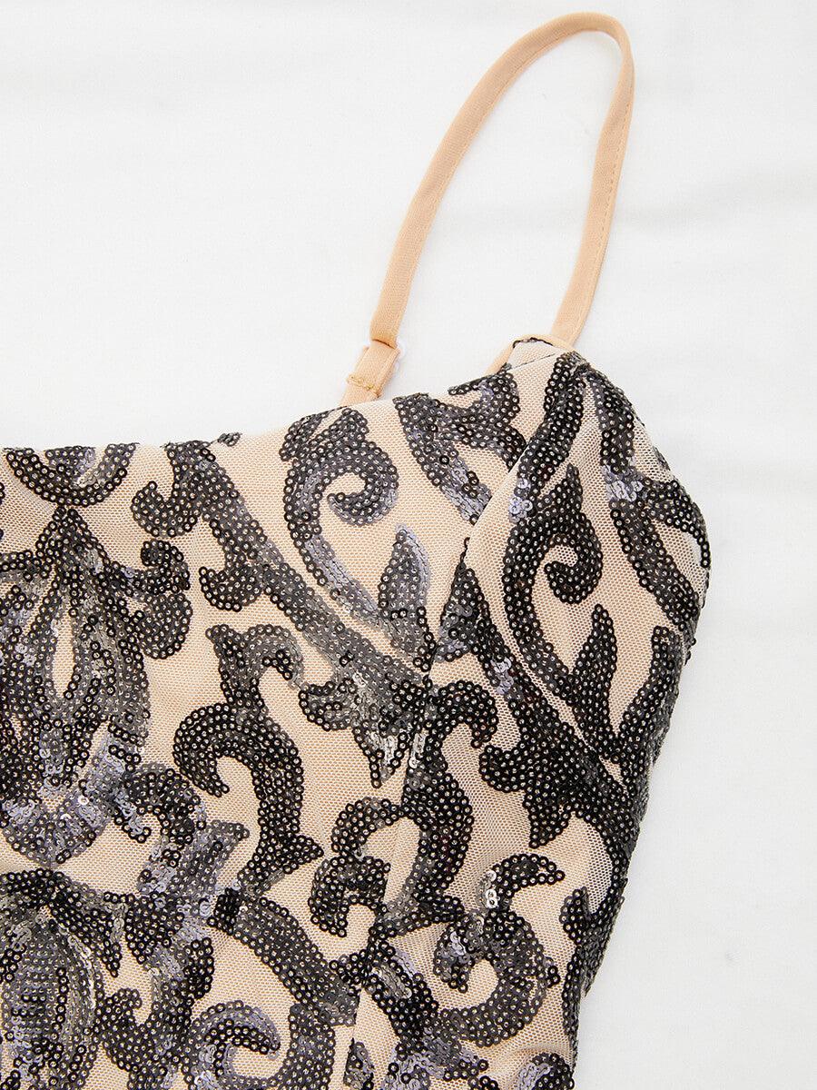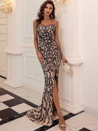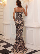 Weibliches sexy hohes geteiltes rückenfreies schwarzes Maxi-Paillettenkleid M0761