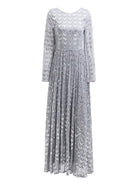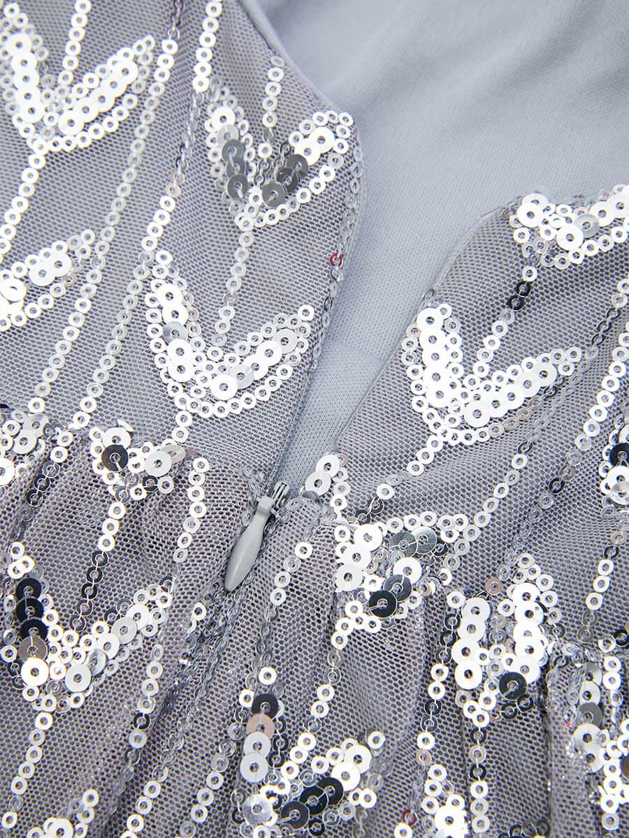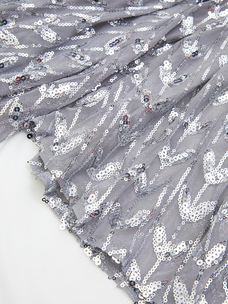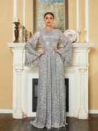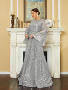 Be the center of attention in this luxurious grey evening dress. Its sleek silhouette includes crew collar bell sleeves and a backless design that will ensure all eyes are on you. Delicate sequins provide a touch of sparkle and sophistication. Be the star of the night without sacrificing comfort in this exquisite dress.