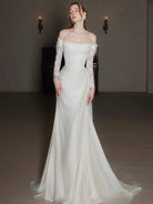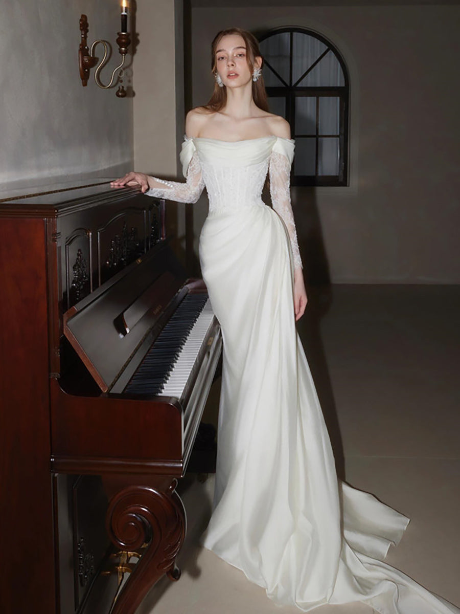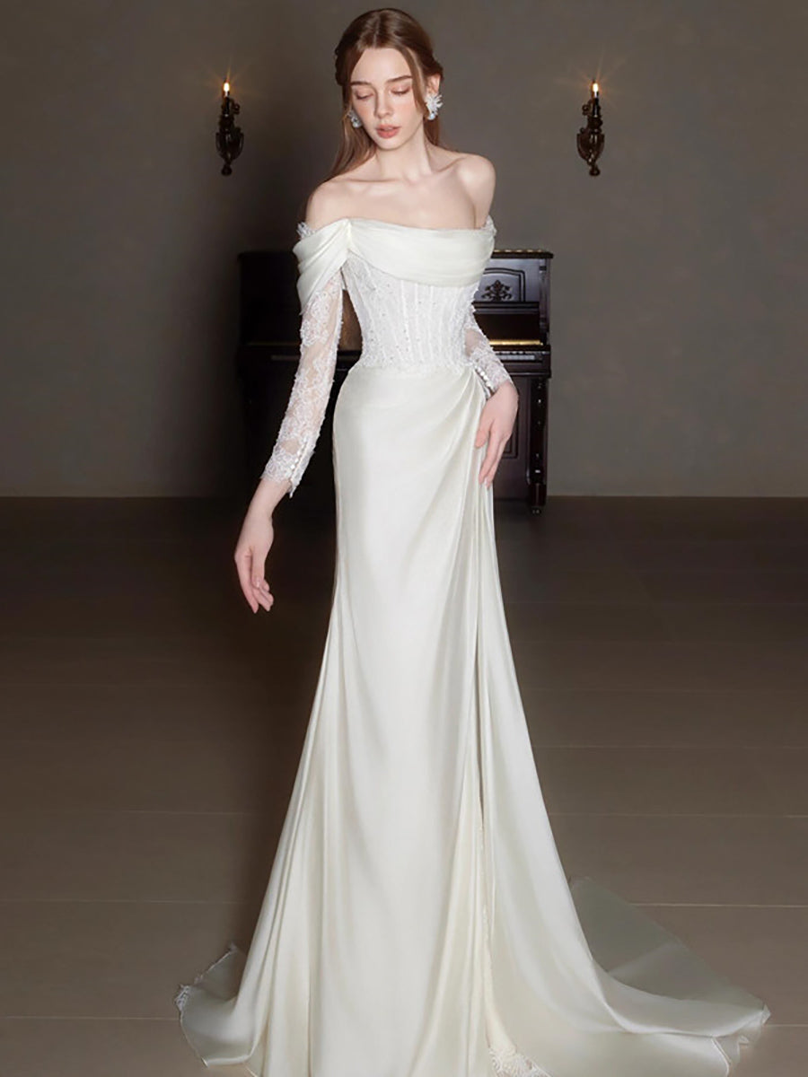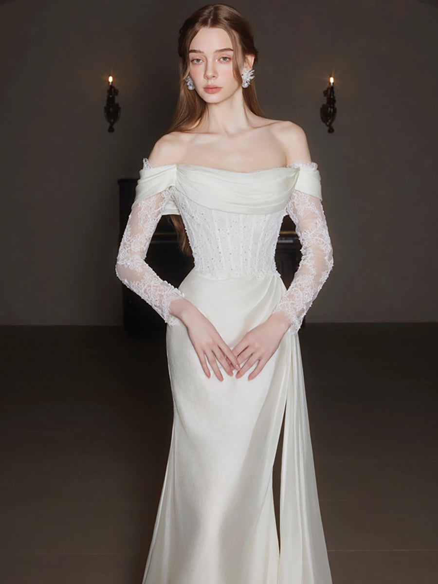 Off-Shoulder Lace Long Sleeve Ruched Corset Bridal Dress MSW072