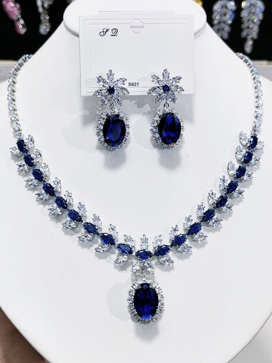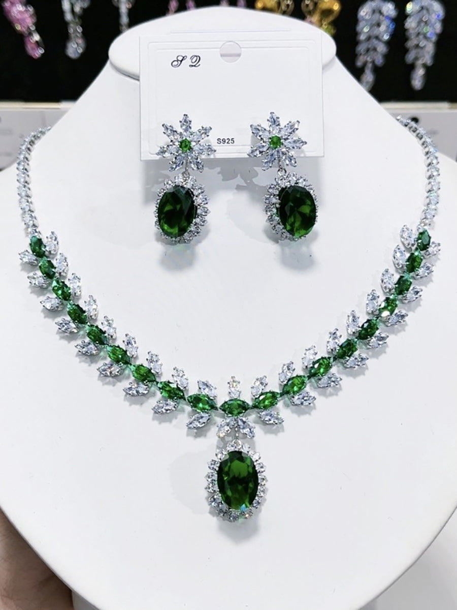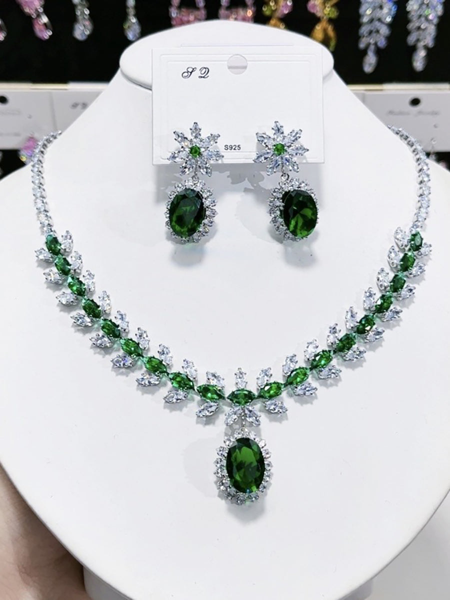 This eye-catching necklace and earring set showcases vivid emerald green oval crystals, encircled by sparkling clear cubic zirconia, all set in electroplated alloy for lasting shine. Perfect for weddings, galas, parties, and special occasions where you want to make a sophisticated statement.