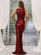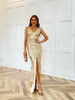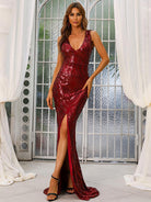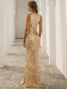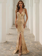 Goldenes Abendkleid mit V-Ausschnitt, geteilter Meerjungfrau und Pailletten M01087