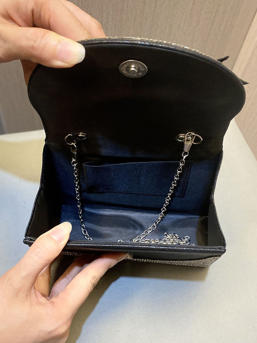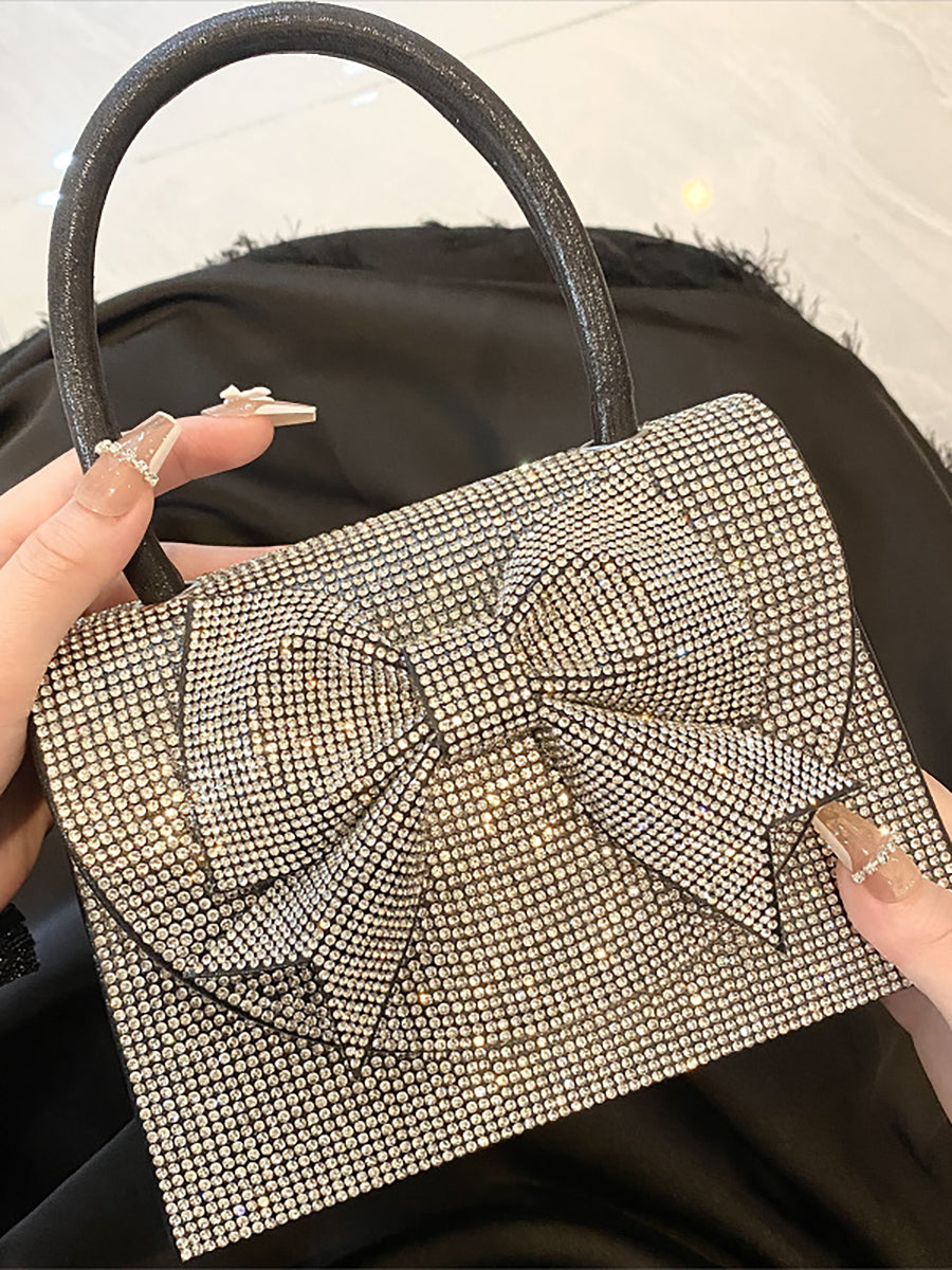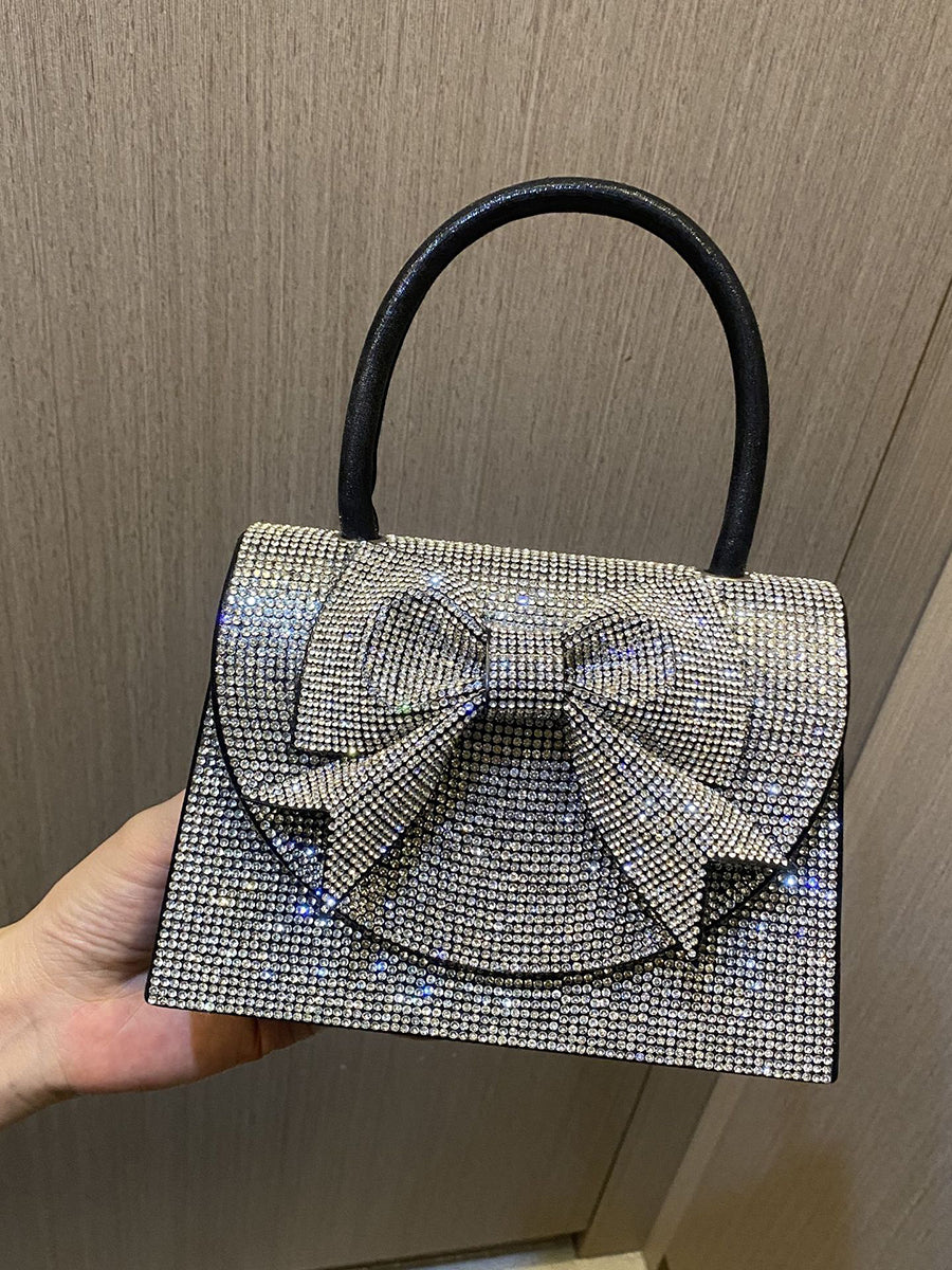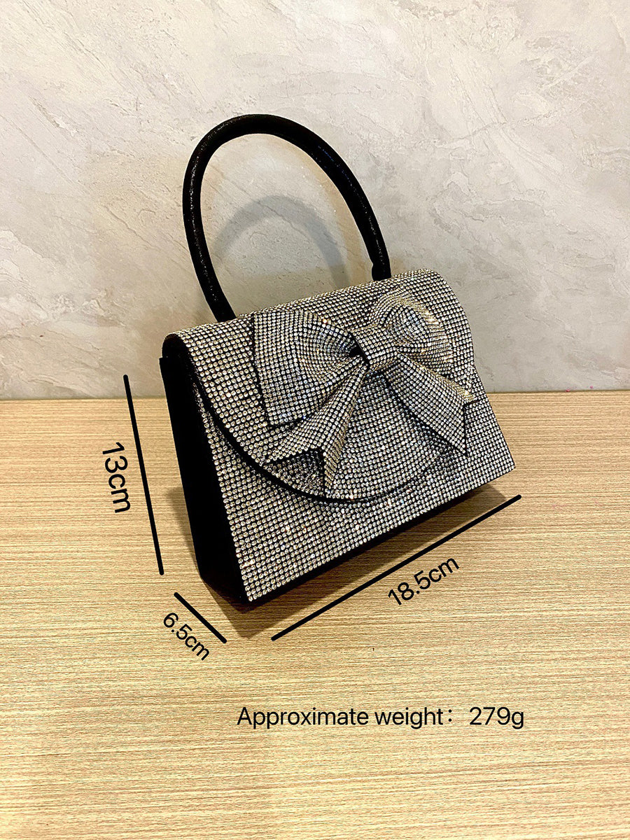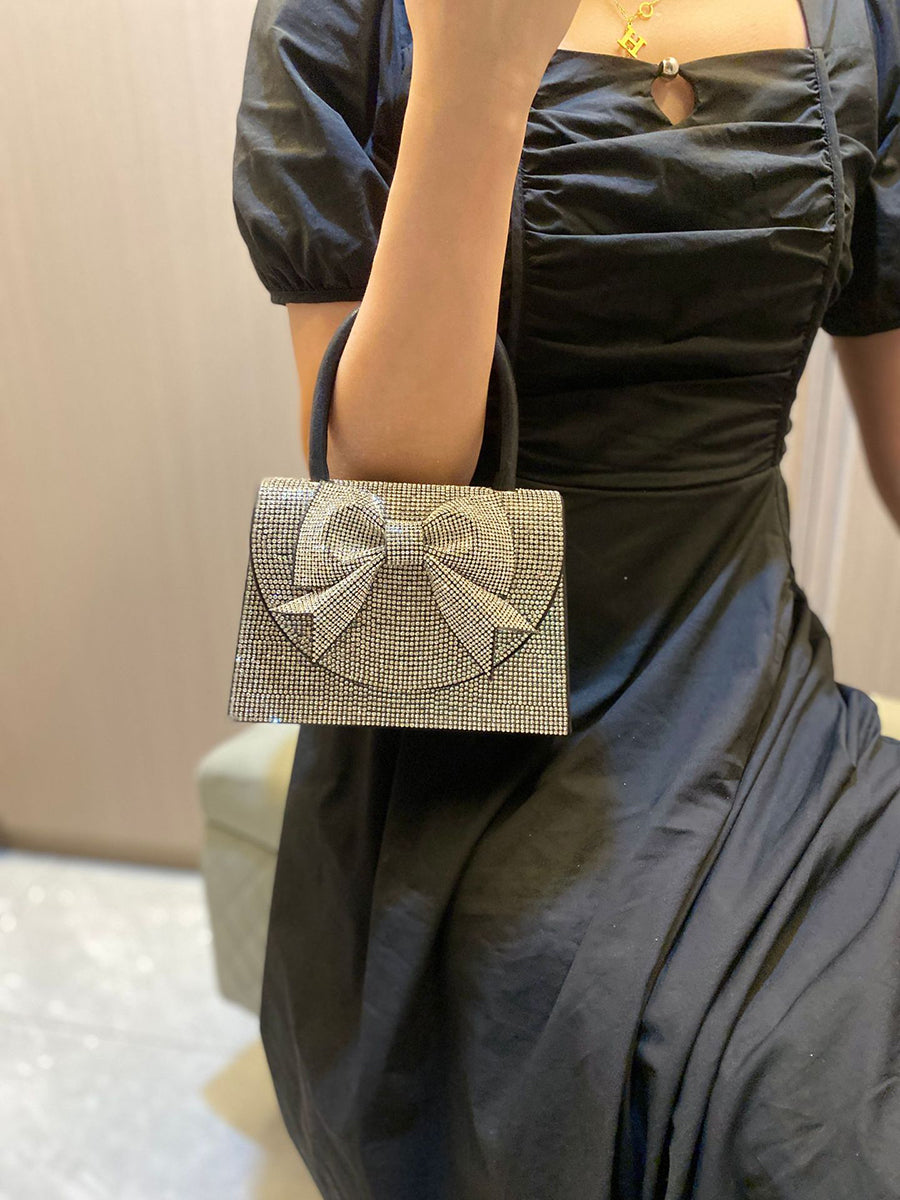 This dazzling clutch is covered in sparkling clear crystals, featuring a large, dimensional crystal bow on the flap for a romantic, eye-catching accent. It is paired with a sleek black top handle, and its structured silhouette offers a secure and glamorous way to carry essentials, making it perfect for parties, weddings, and nights out.