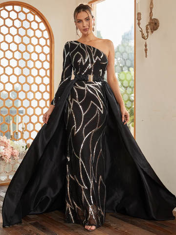 3.One Shoulder A-Line Draped Sequin Maxi Black Prom Dress XH2172