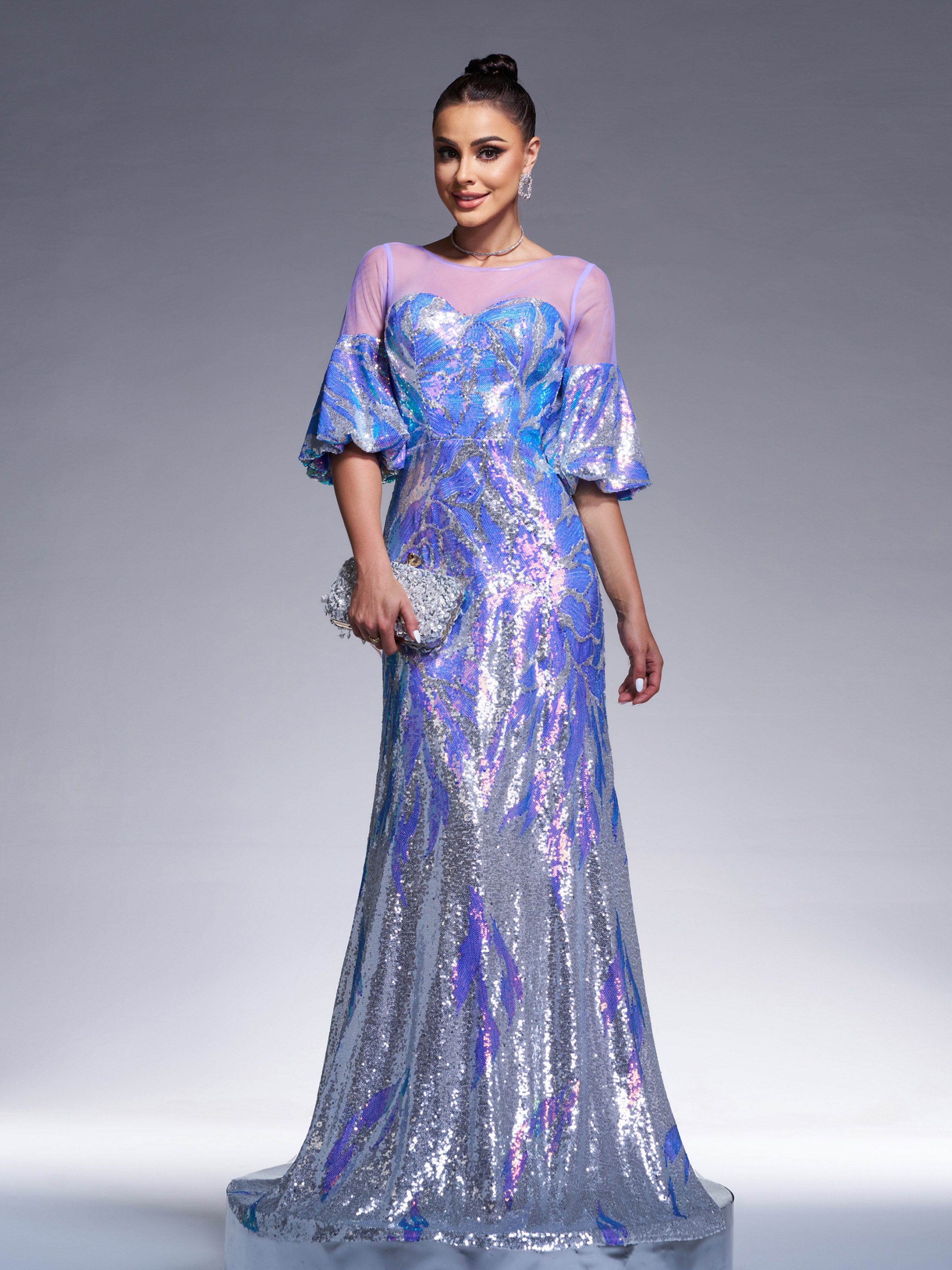 Sequin Panel Mesh Sleeve Mermaid Formal Dress GM00635