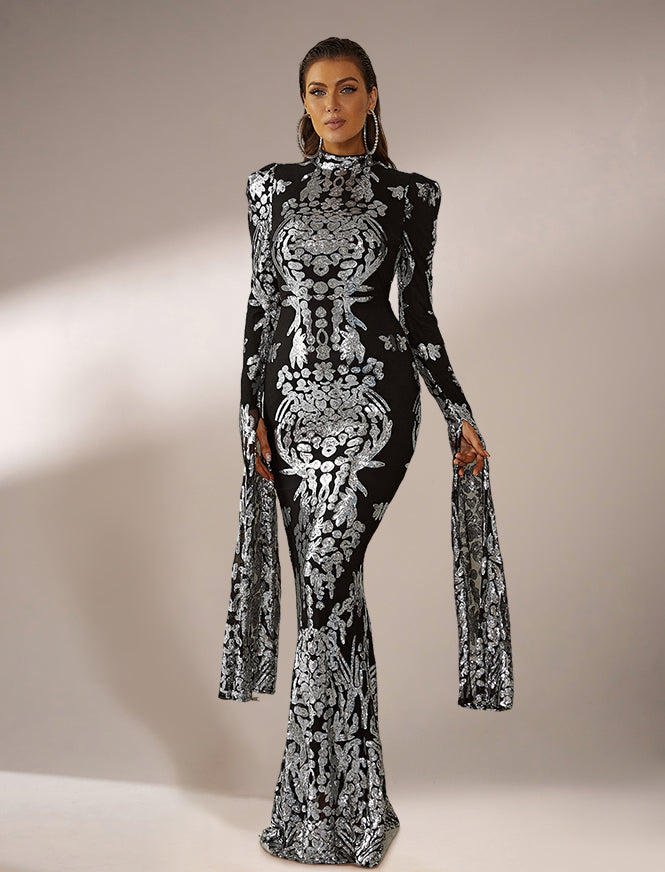 Stand Collar Long Sleeve Mermaid Sequin Prom Dress XJ1262