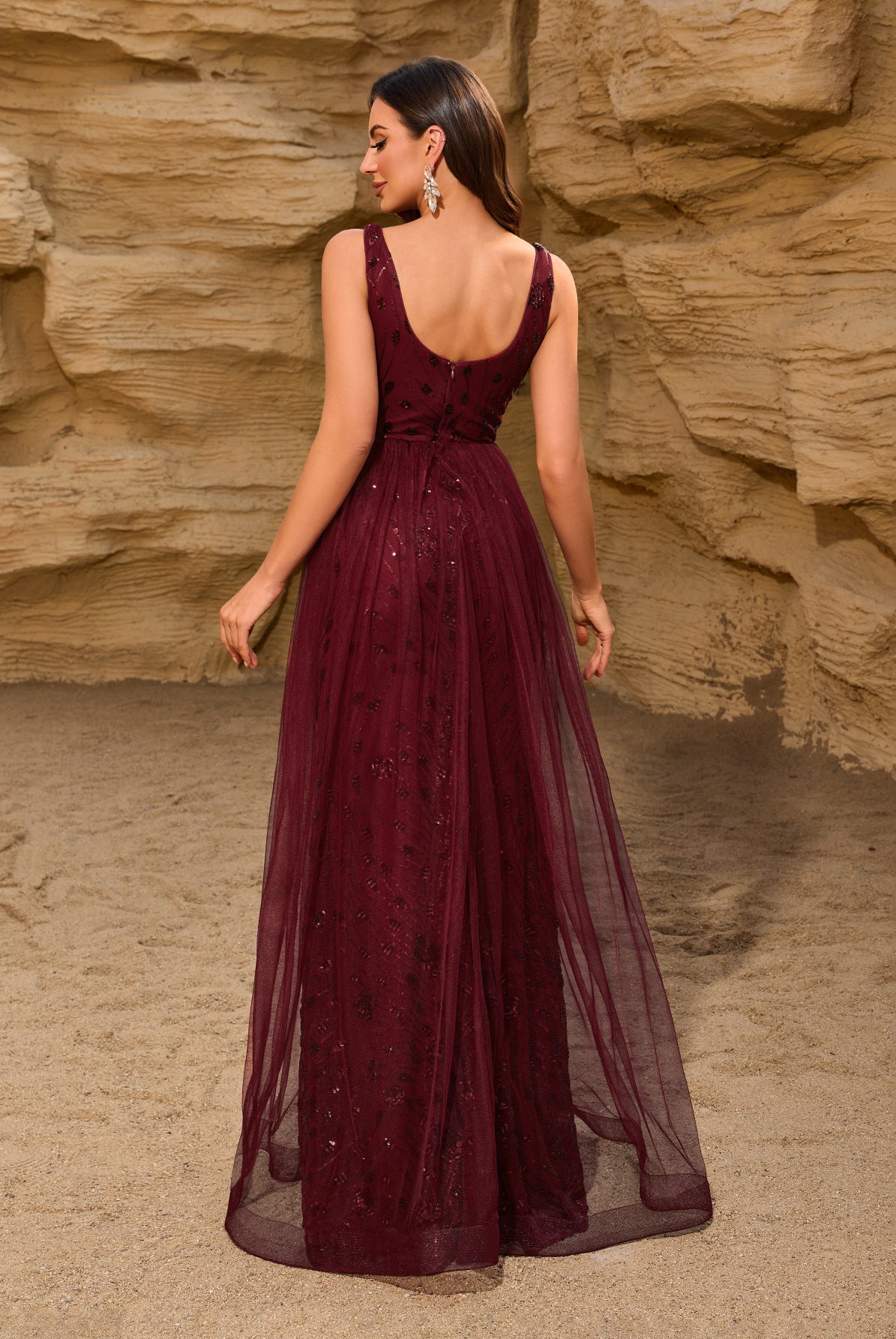 Designed for unforgettable entrances, this burgundy sequin gown features a flattering V-neck silhouette and a flowing sheer cape that adds elegant movement.