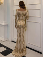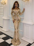 Get ready to dazzle in this Square Neck Geo Maxi Sequin Hem Golden Prom Dress! Featuring a unique square neckline and eye-catching sequin hem, this dress is perfect for any formal occasion. The geometric pattern adds a touch of fun and the golden color will have you shining all night long. (Sequin-enthusiasts approved!)