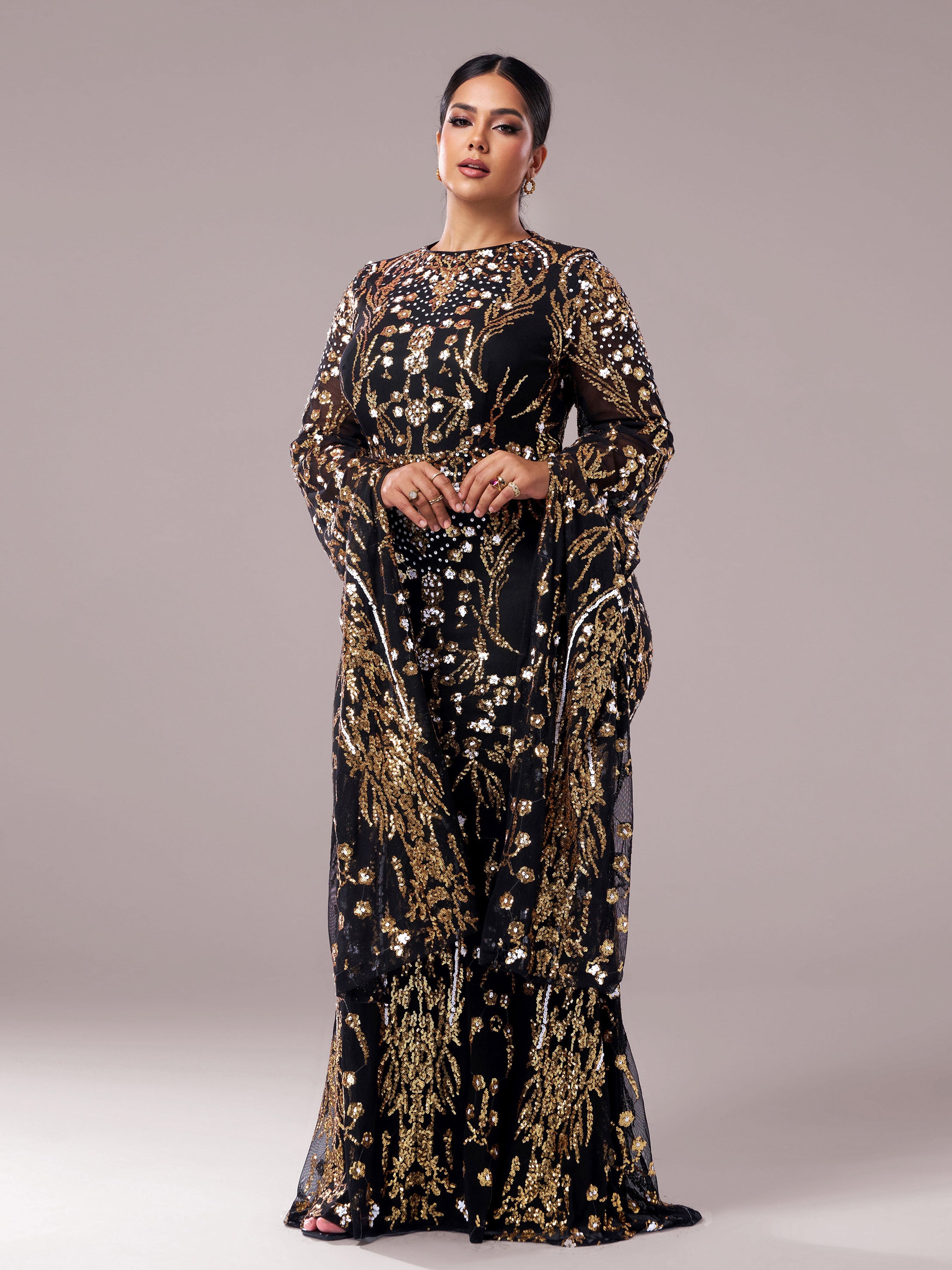Black Ruffled Mesh Sequin Split Formal Dress GM90165