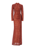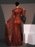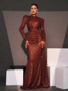 Stand out in style with our Full Cover Long Sleeve Brown Sequin Formal Dress! Show off your playful side with this quirky and fun dress, featuring a full coverage design and stunning sequin detailing. Whether you're heading to a formal event or just want to make a statement, this dress has got you covered.