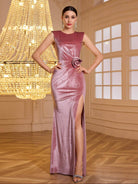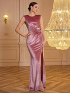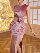 Designed for refined formal events, this mauve velvet gown features a sleeveless round neck, ruched detailing, and a 3D rose accent + high slit for soft elegance.Perfect for weddings, galas, and evening celebrations.