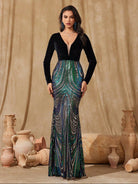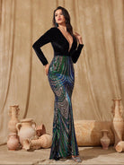 Designed for upscale formal occasions, this two-tone gown features a black velvet long-sleeve bodice and a multi-colored sequin mermaid skirt for opulent contrast.Perfect for galas, weddings, and statement-making evening events.