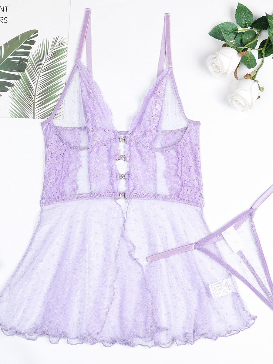 Lavender See-through Sexy Polka Dot Lace Two-piece Set MSL087