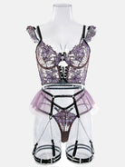 This four-piece lingerie set features an eye-catching, embroidered flower design that is both seductive and elegant. The sheer fabric ensures maximum comfort while giving off a sexy and sophisticated look. The perfect outfit for a special evening.