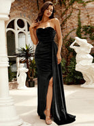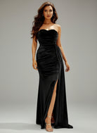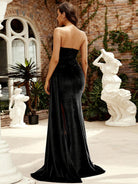 Trägerloses, drapiertes Samt-Maxi-Abschlussballkleid in Schwarz M02119