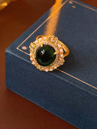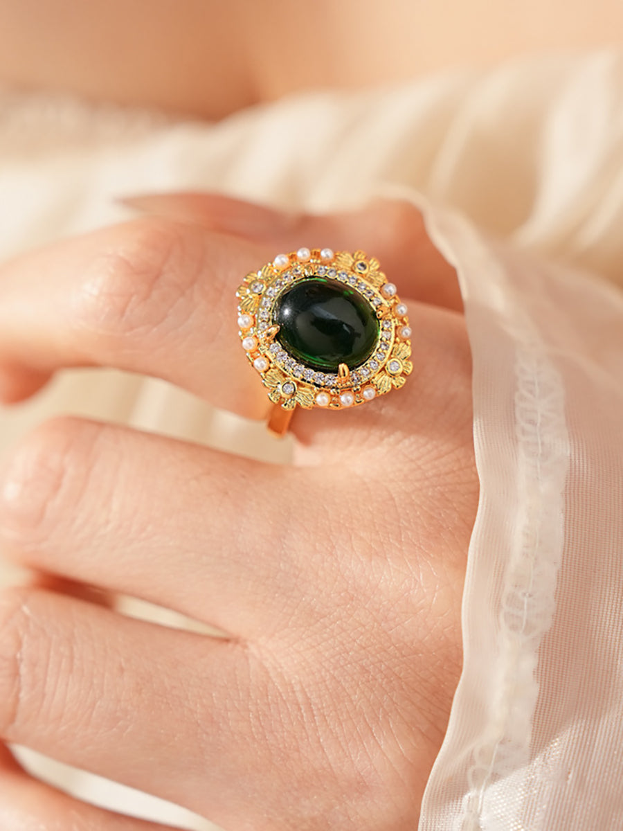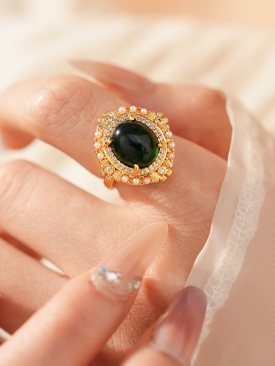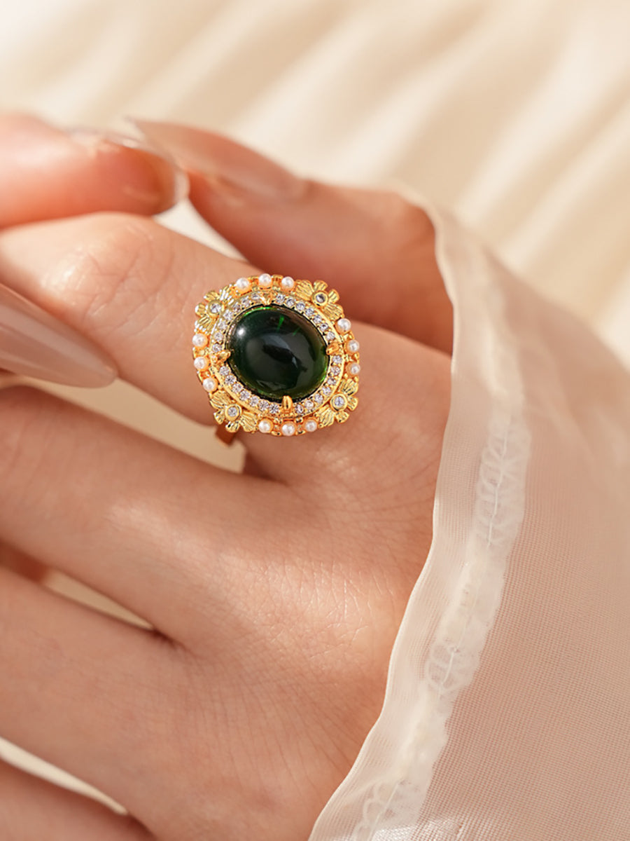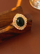 This luxurious vintage-inspired ring features a bold oval emerald-green crystal at its center, surrounded by a halo of sparkling zircons and delicate faux pearls, all set in intricate gold-plated copper. Its ornate, dimensional design evokes old-world glamour, making it a standout statement piece for special occasions.