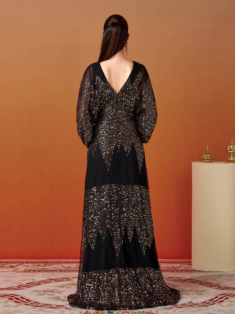 Lantern Sleeve V-Neck High Split Black Prom Dress RM21107