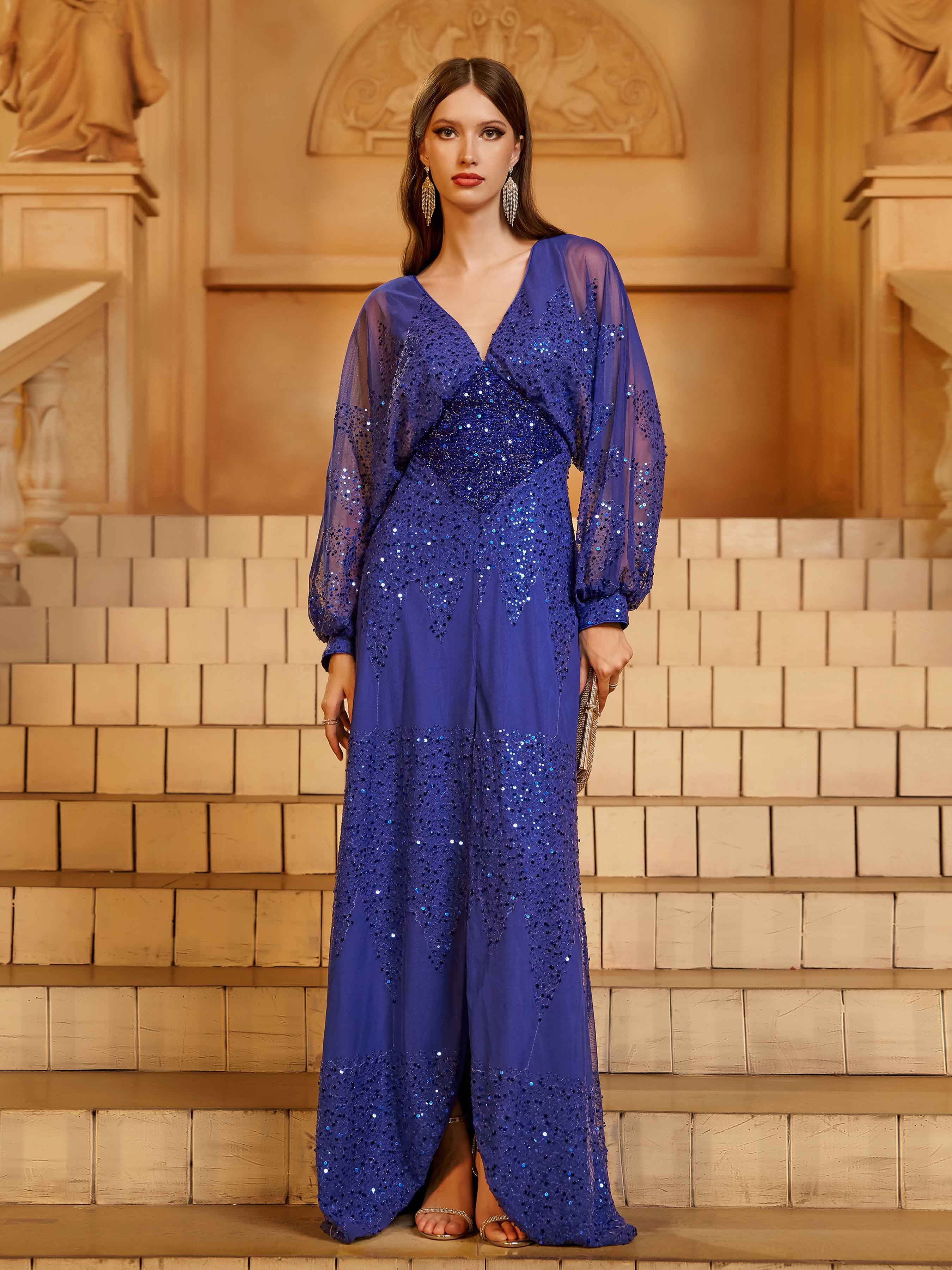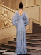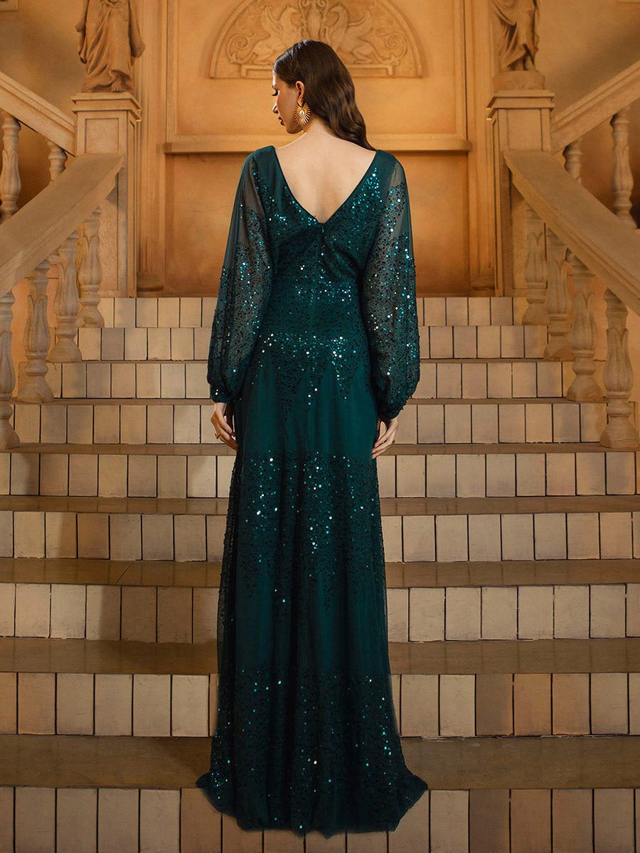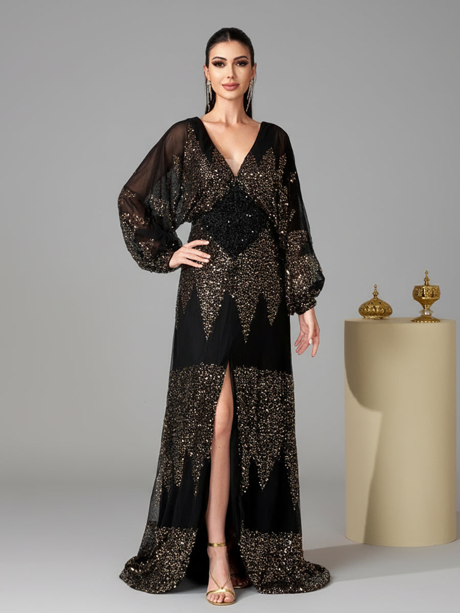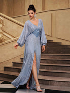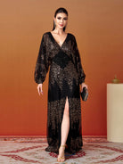 Dazzle in this Lantern Sleeve V-Neck High Split Prom Dress! With its elegant lantern sleeves and alluring high split, you'll turn heads all night long. The V-neckline adds a touch of sophistication while the sleek black color is both timeless and versatile. Elevate your prom experience with this stunning dress.