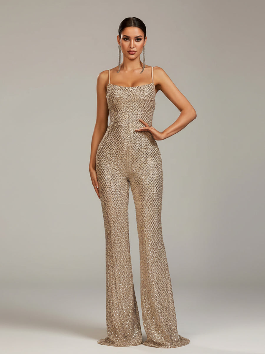 Spaghetti Strap Sleeveless Sequin Apricot Prom Jumpsuits RA60038