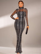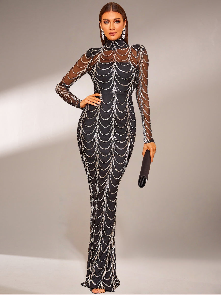 This black mermaid prom dress exudes a sophisticated elegance with a sequin-covered, sheer mesh yoke and long sleeve mock neck design, perfect for an evening event.