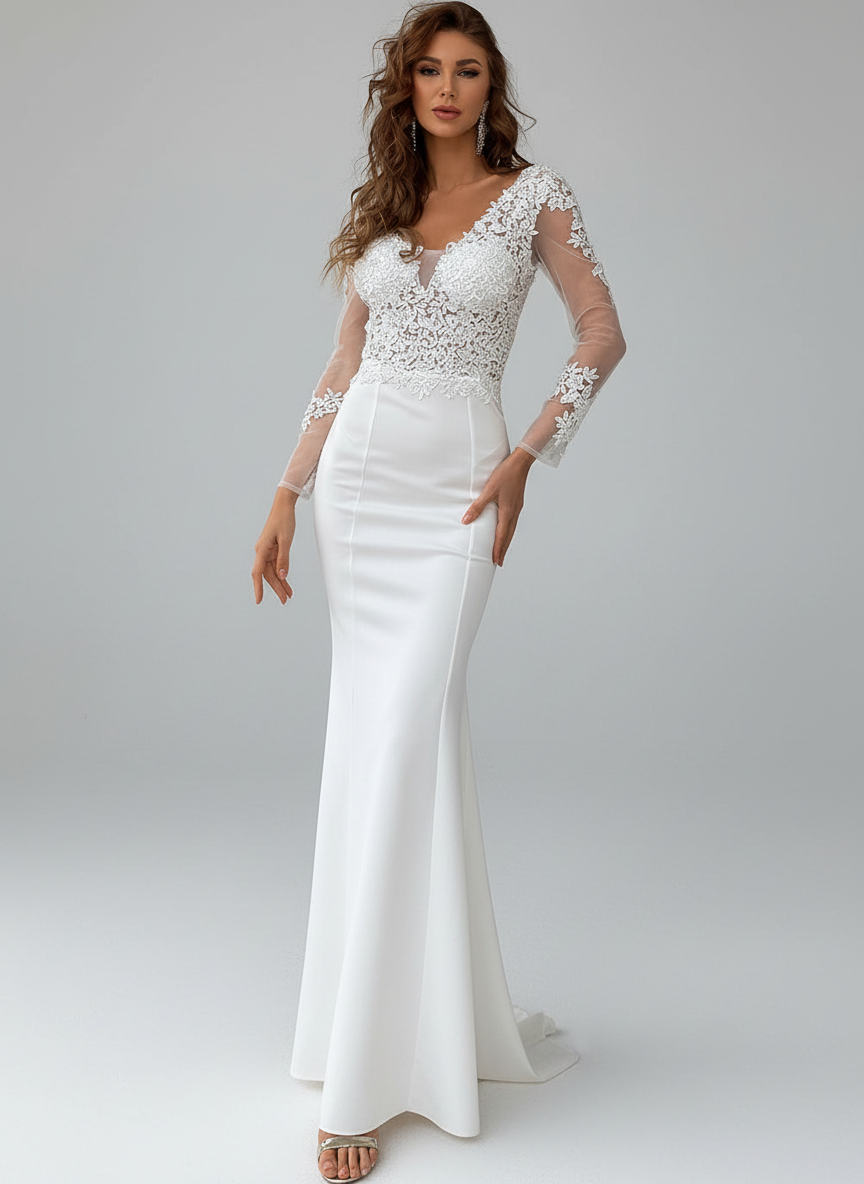Elevate your evening elegance with this long sleeve mermaid gown featuring intricate embroidered applique details. Designed to showcase a flattering silhouette, it hugs your curves gracefully while the delicate embroidery adds a touch of refined sophistication. Perfect for special occasions, this gown ensures you stand out with timeless style and poise.