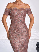Añadir un toque de brillo a su noche con el cuello de la colmena vestido de noche de lentejuelas negro. Hecho a mano con una lujosa tela de lentejuelas y acentos de volantes, este vestido halaga tus curvas al tiempo que agrega un toque de glamour. La elección perfecta para una noche memorable.