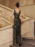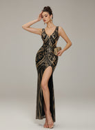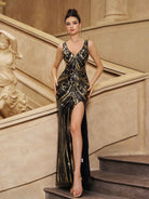 Gold Sequin Graphic Split Cocktail Dress GM00930