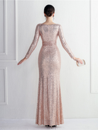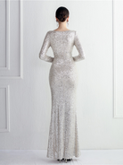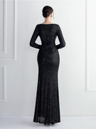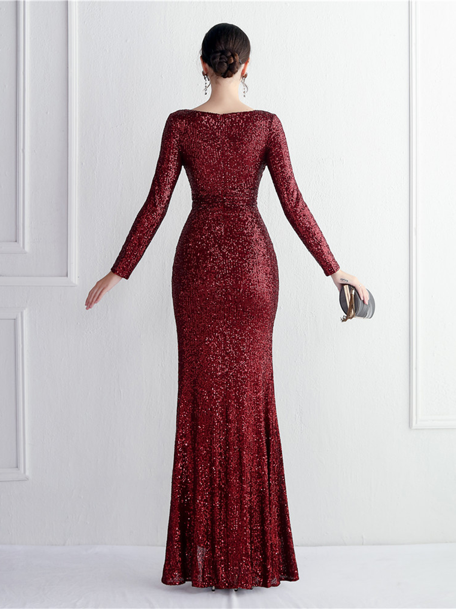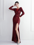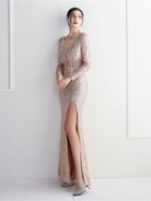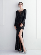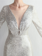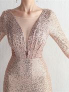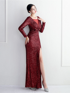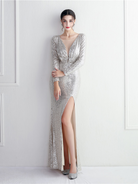 This formal V-neck sequin green prom dress is designed to make you stand out at any event. Its long sleeves and high split provide both elegance and comfort. Perfect for a glamorous and sophisticated look.