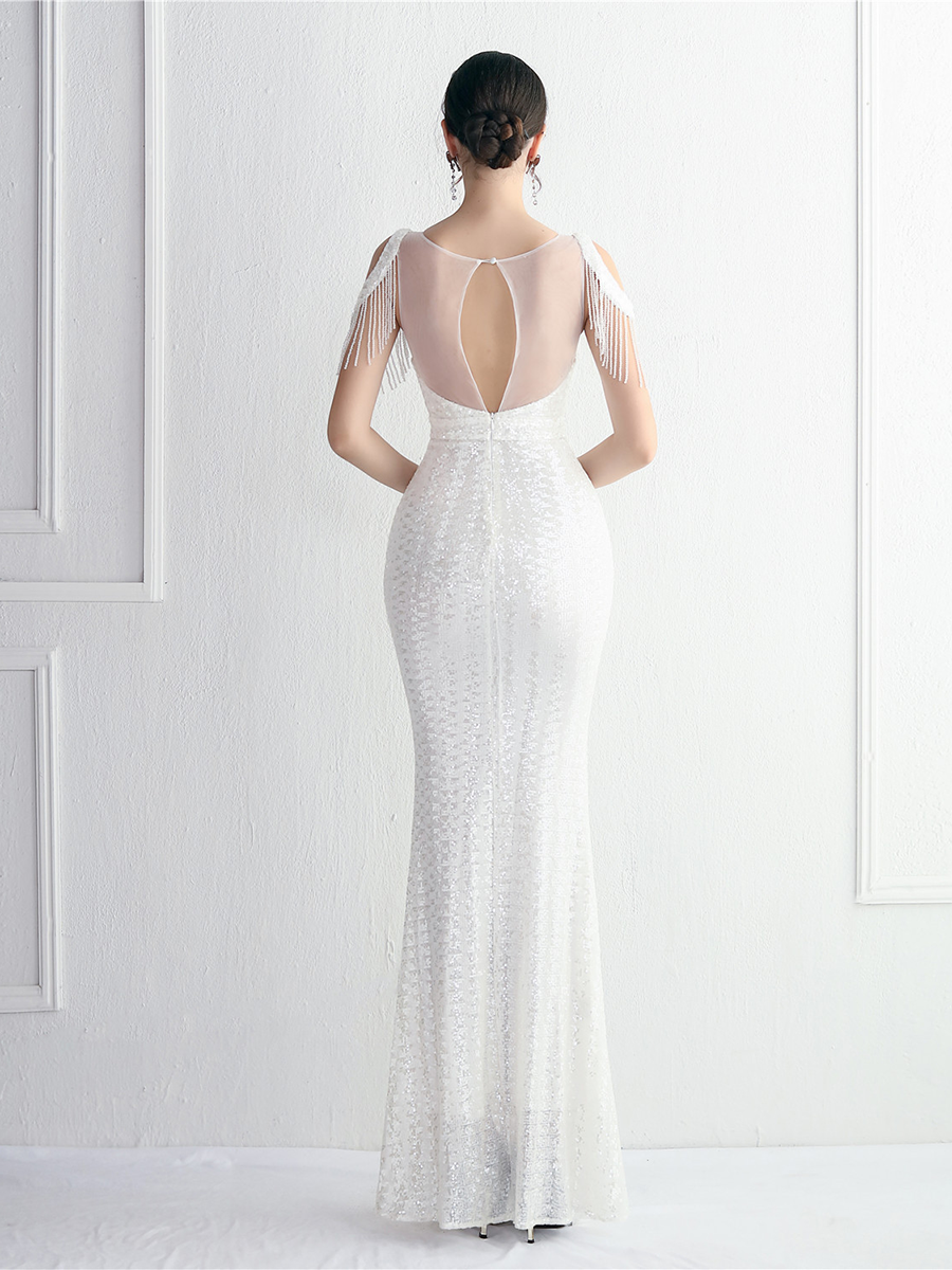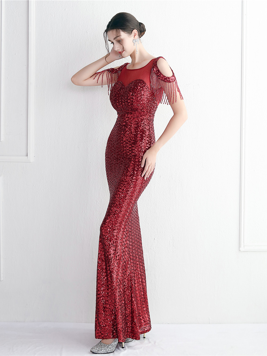 Be the belle of the ball in this gorgeous Cold Shoulder Fringed Sequin Black Evening Dress! This classic black dress has a flattering, cold shoulder cut with an exquisite fringe and sequin detailing, making it perfect for your next formal event.