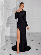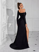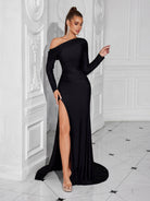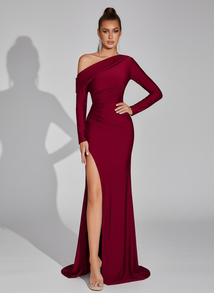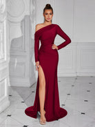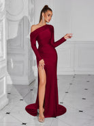 Burgundy One-Shoulder Long Sleeve Prom Maxi Dress XF250129