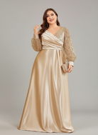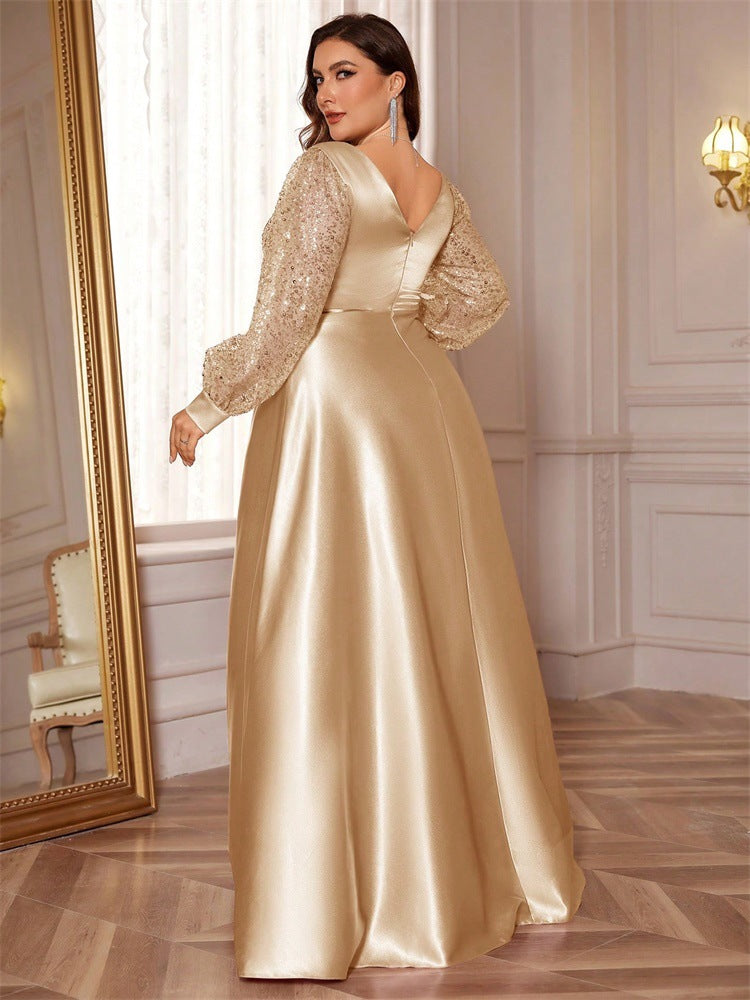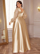 Plus Satin Sequin Long-Sleeve Formal Dress PXF25128