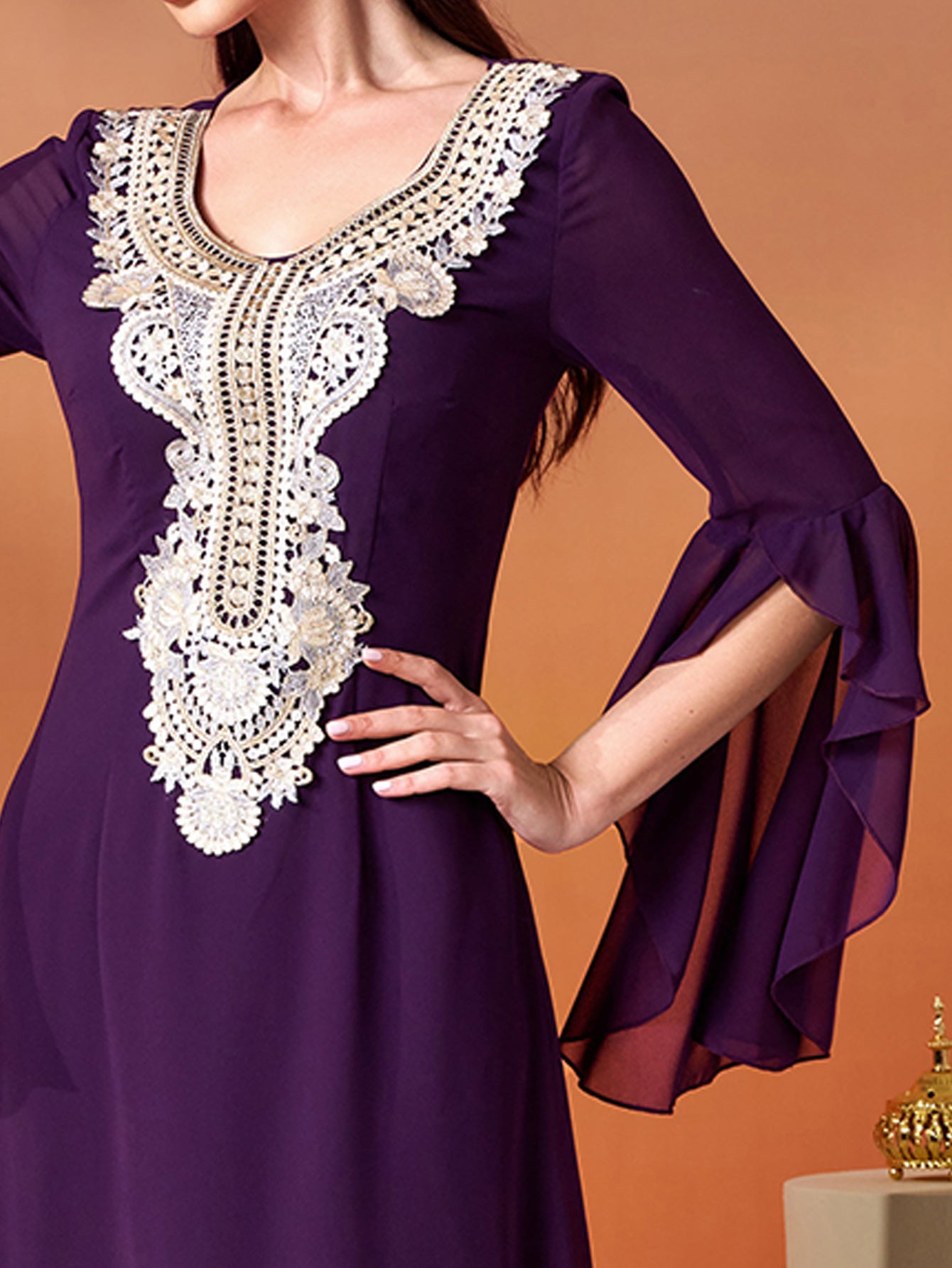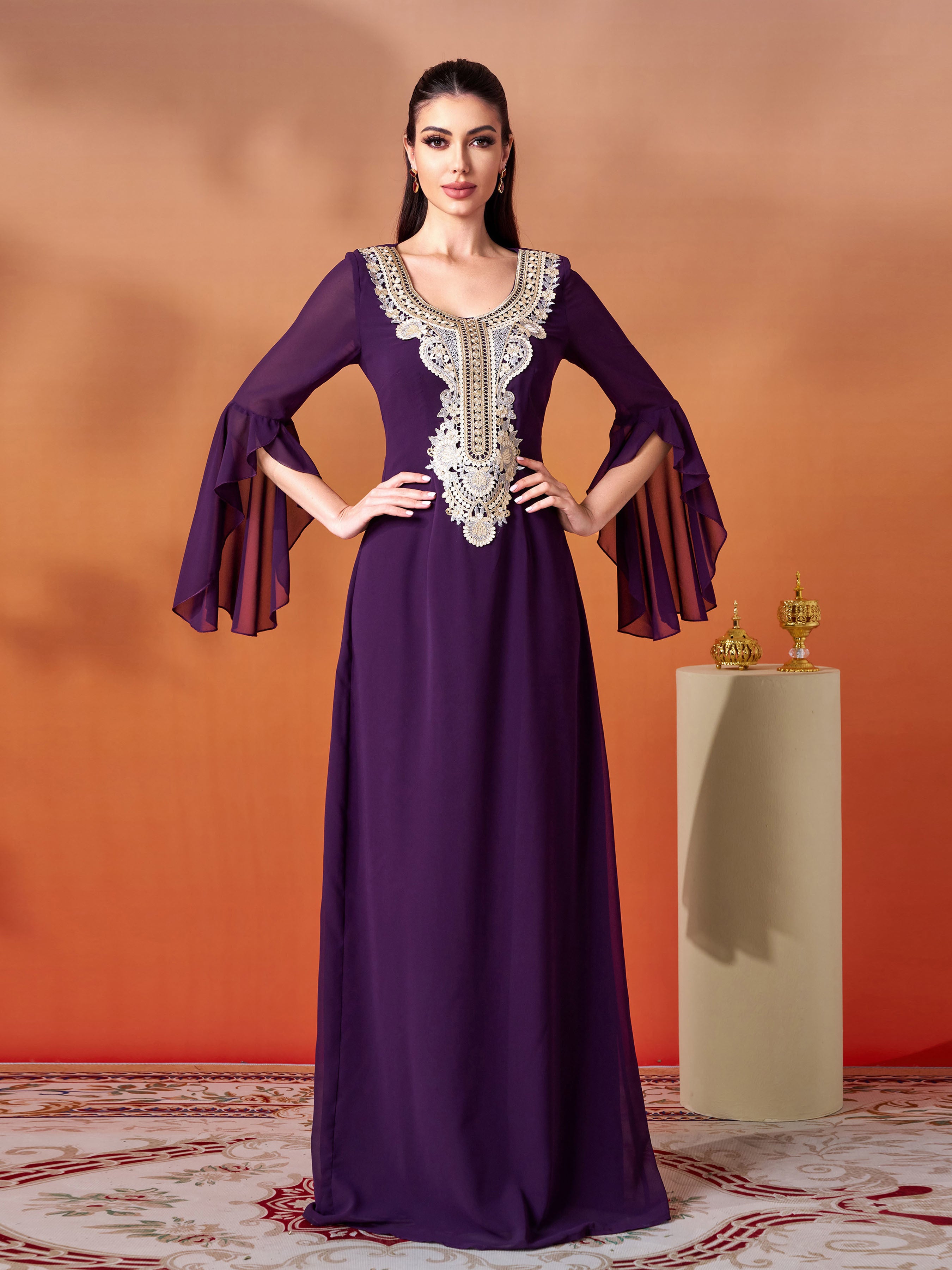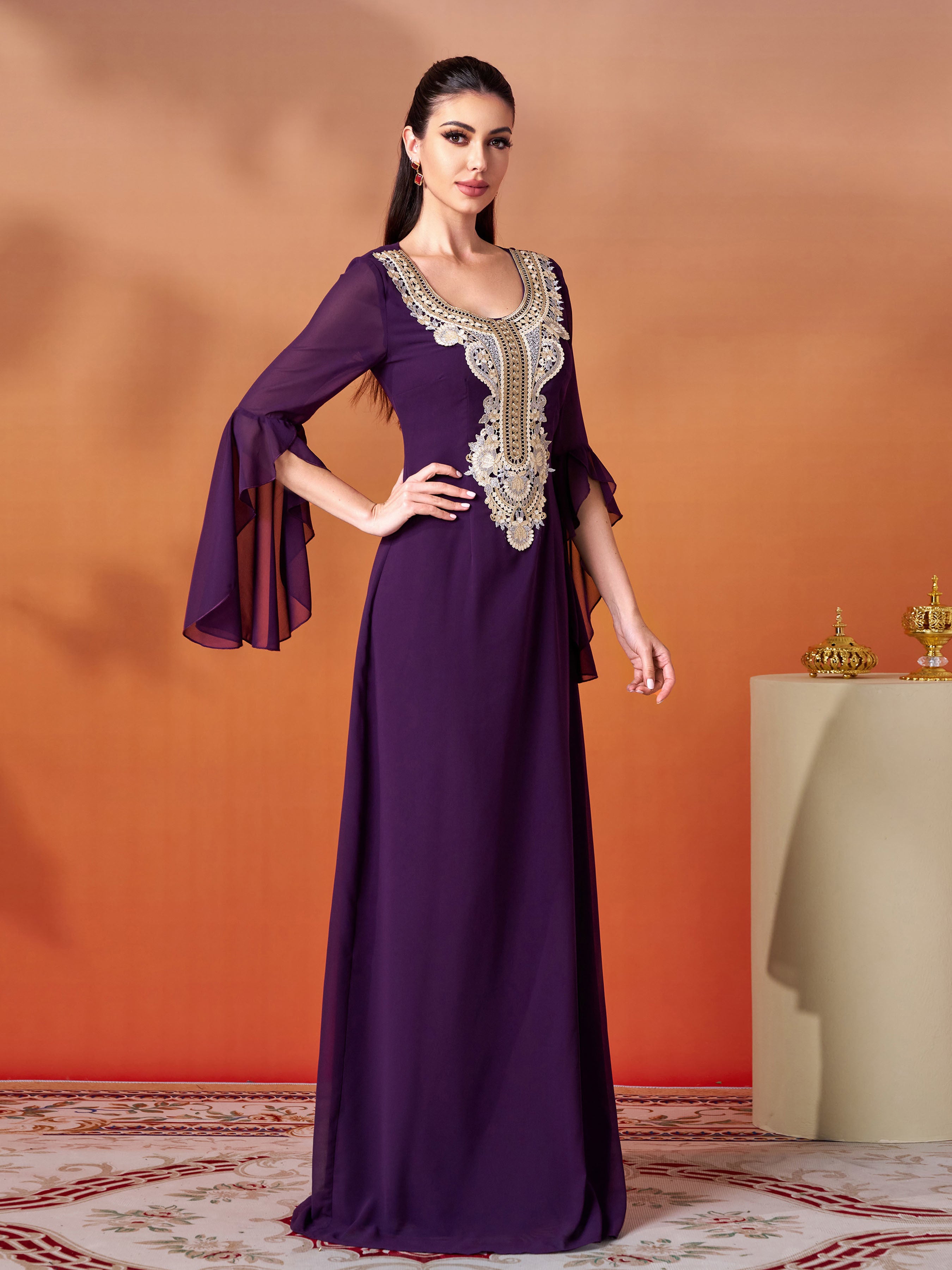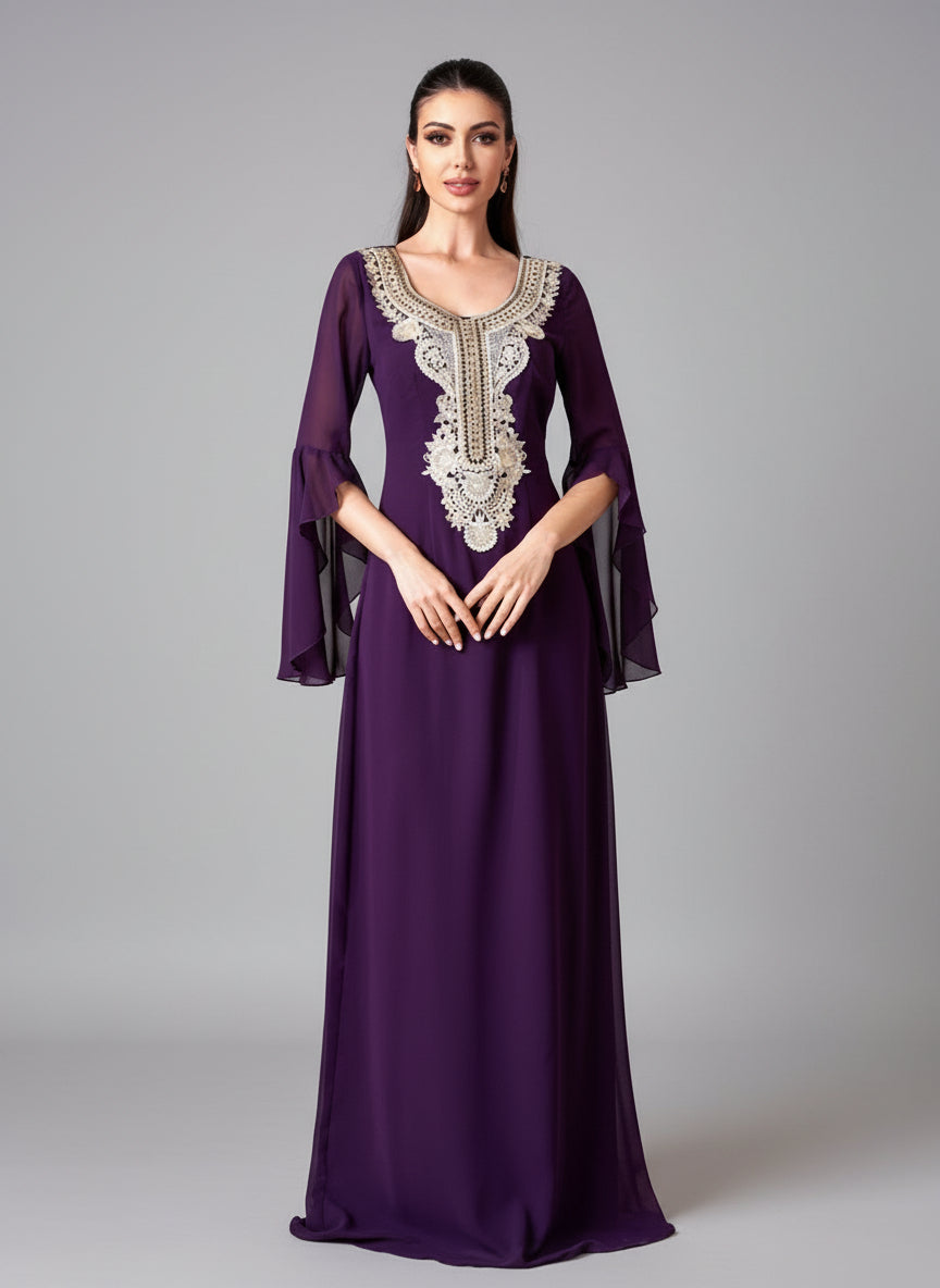 Embrace timeless allure in this purple maxi gown. Its ornate gold embroidered neckline and billowy flared sleeves fuse heritage-inspired detail with effortless elegance, making it a standout choice for events where you crave both grace and cultural richness.