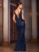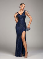 Navy Sequin Chain Strap Slit Mermaid Formal Dress GM90177