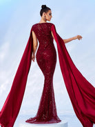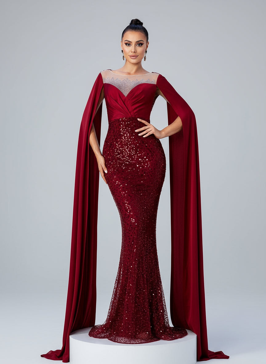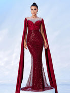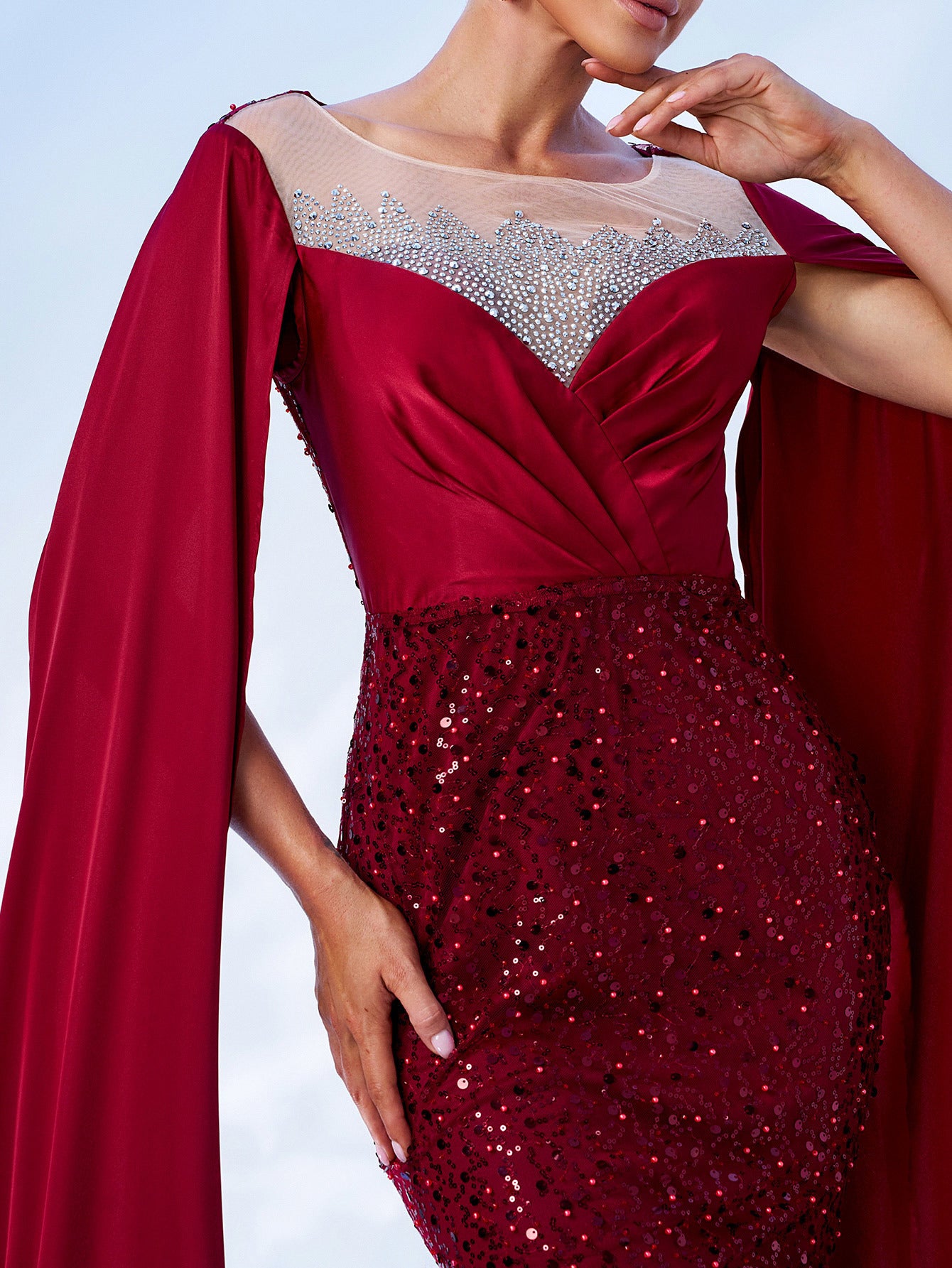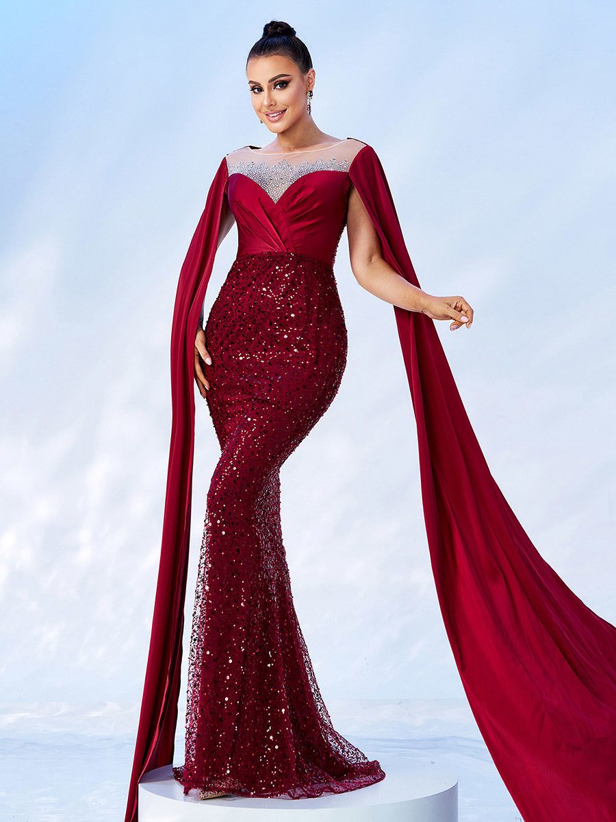 Red Panel Sequin Long Sleeve Mermaid Evening Dress RJ11967