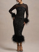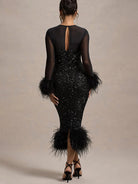 Slip into pure glamour with this show-stopping black cocktail dress that demands attention. Luxurious feather detailing adorns the neckline and sleeves, creating an ultra-feminine silhouette that's impossible to ignore. The bodycon fit hugs your curves in all the right ways, while shimmering sequins catch the light with every move. Perfect for cocktail parties, nights out, or any occasion where you want to feel absolutely fabulous. This dress transforms you into the main event.