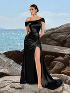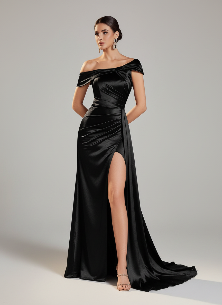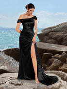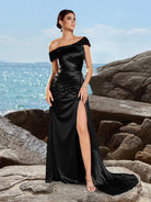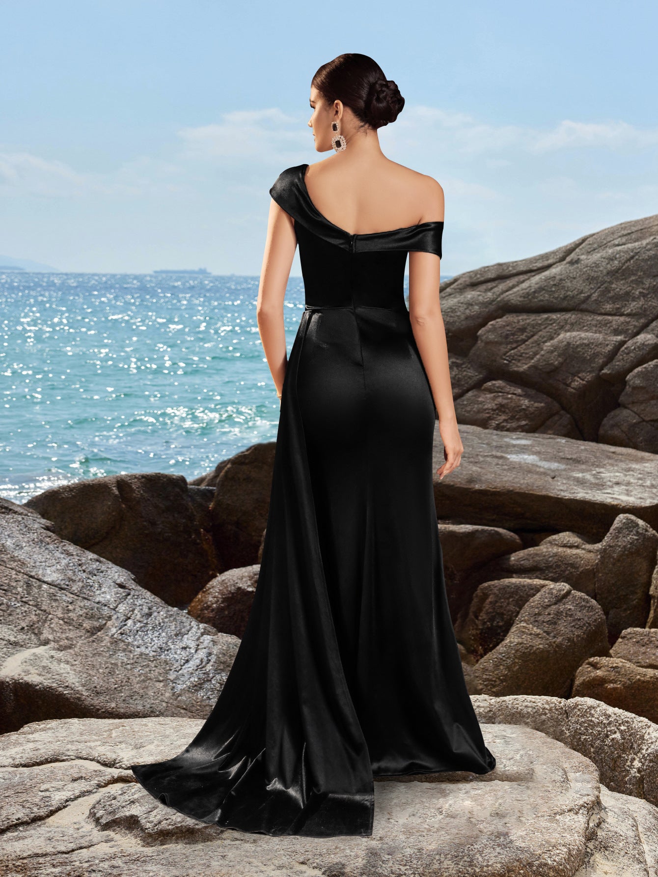 Black One-Shoulder Slit Satin Maxi Dress XF250126