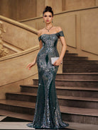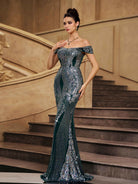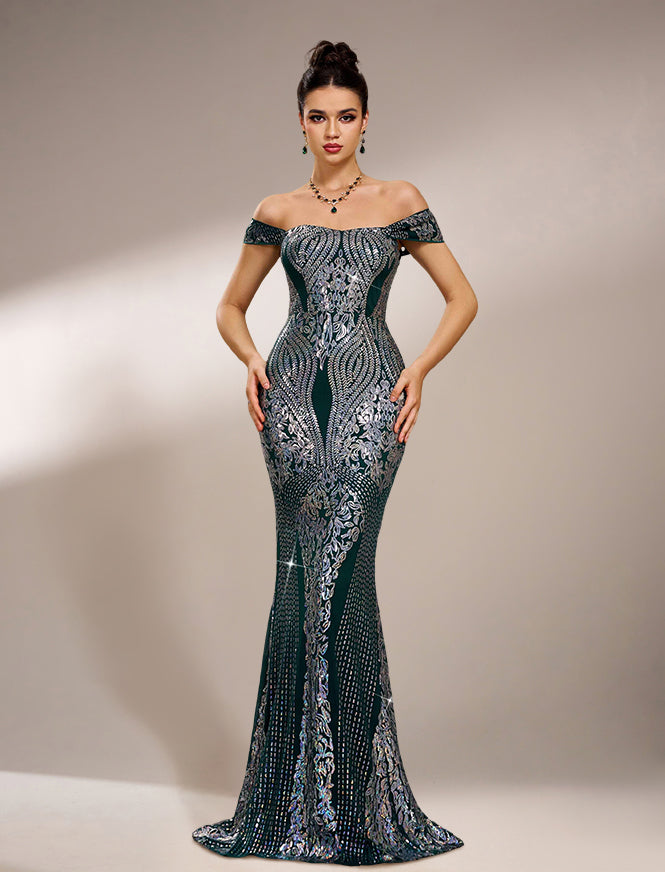 Green Sequin Off Shoulder Graphic Evening Dress GM00774
