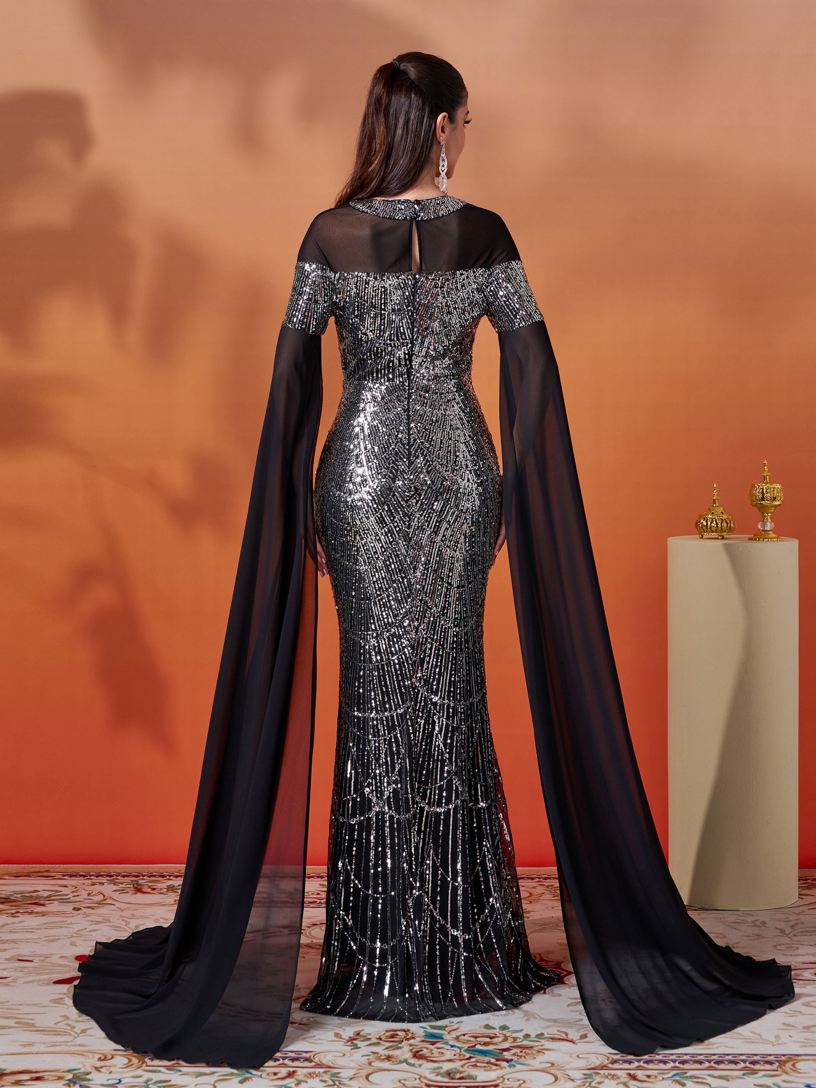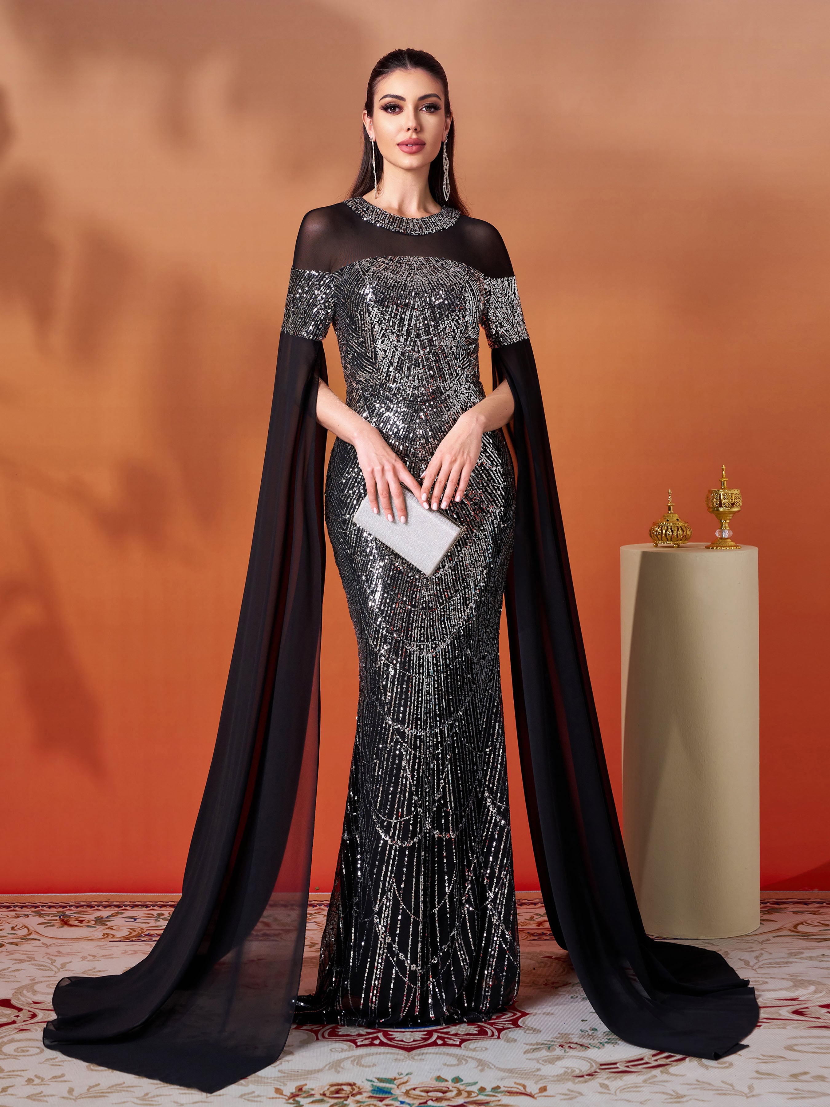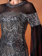 Black Sequin Cape Sleeve Elegant Evening Dress GM00706