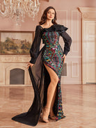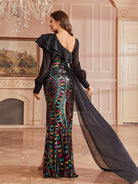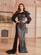 This head-turning gown is made for stealing the spotlight at your next big event! It’s decked out in eye-popping multi-color sequins (think rich teals, pinks, and golds) over a sleek black base, plus dramatic ruffled shoulders with pearl accents and flowy sheer long sleeves. The mermaid silhouette hugs your curves perfectly, and the side slit + trailing sheer train add that extra dose of red-carpet glamour.