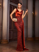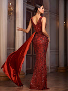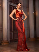 Turn heads in this Elegant Drape Satin and Sequin Embellished Mermaid Evening Gown RJ12169. Sleek satin and sparkling sequins dance together to create a dazzling silhouette that hugs your curves perfectly. The sleeveless design adds a flirty touch, making it ideal for twirling under the spotlight all night long. Get ready to sparkle with confidence and charm at every event!