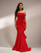 Look stunning in this off-shoulder evening dress. Crafted with unique three-dimensional floral details, the backless and strapless design adds a touch of sophistication. Perfect for an elegant evening, this dress features a rich red or brown color.