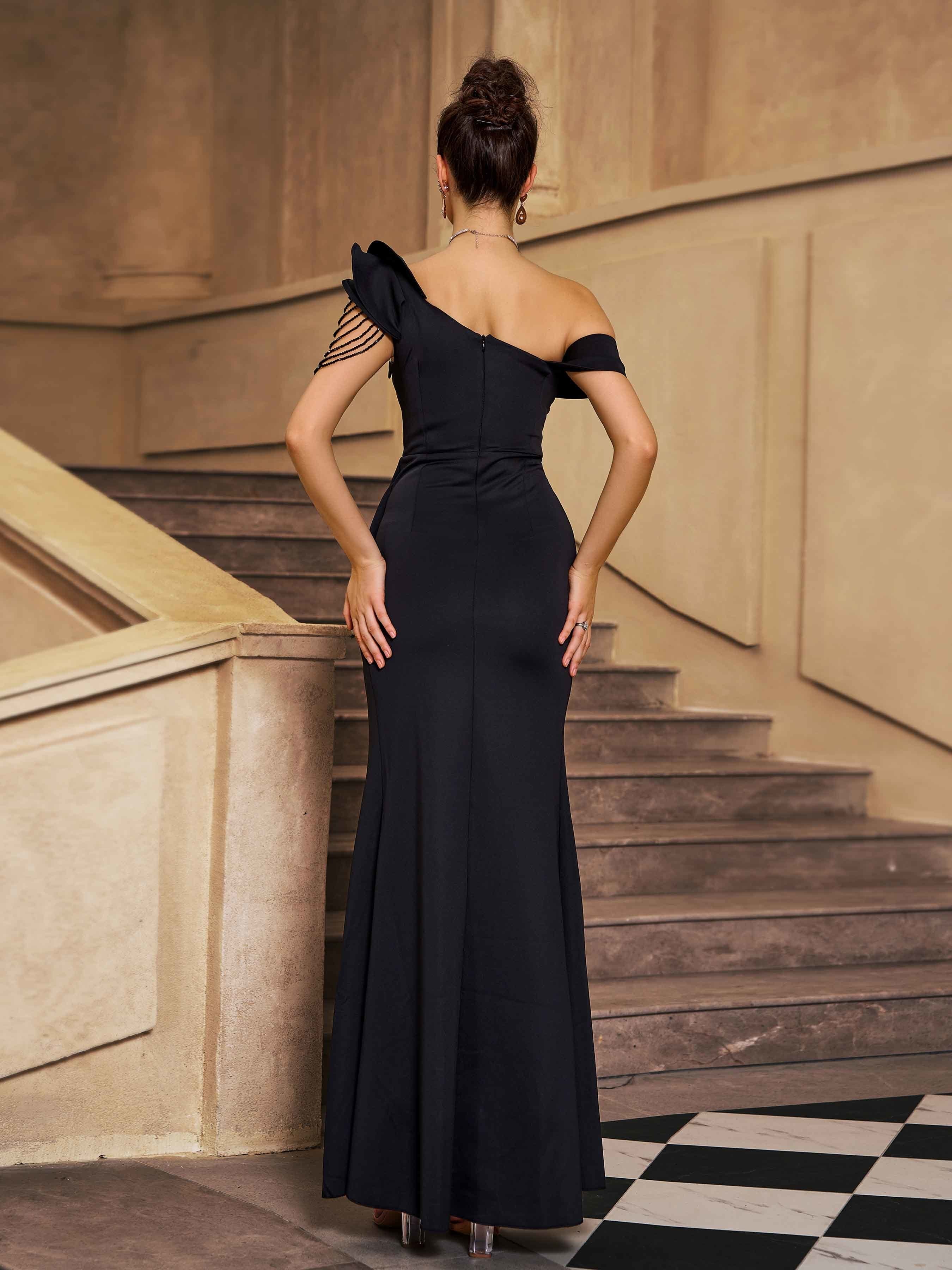 Elegant Black One-Shoulder Slit Evening Dress GM010145